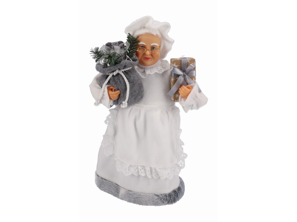 Vánoční figurka babička Mikuláška je vyrobena z plastu, na hlavě má bílý klobouček.