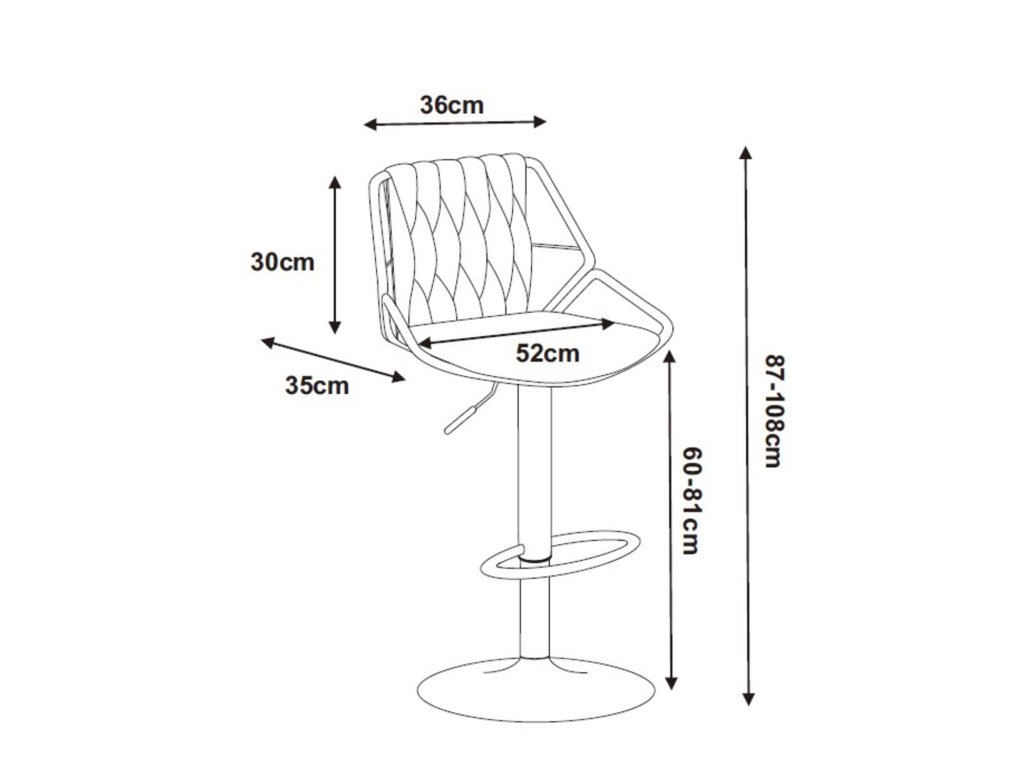 Díky nastavitelné výšce sedáku (60–81 cm) se snadno přizpůsobí různým výškám pultu. Stabilní kruhová základna, praktická opěrka nohou a otočný mechanismus vytvářejí pohodlí pro každodenní snídani i večerní posezení ve stylu.
