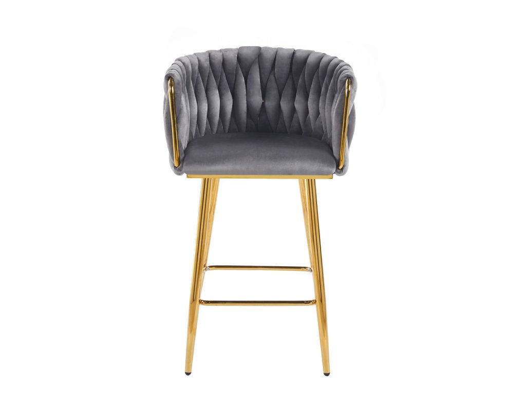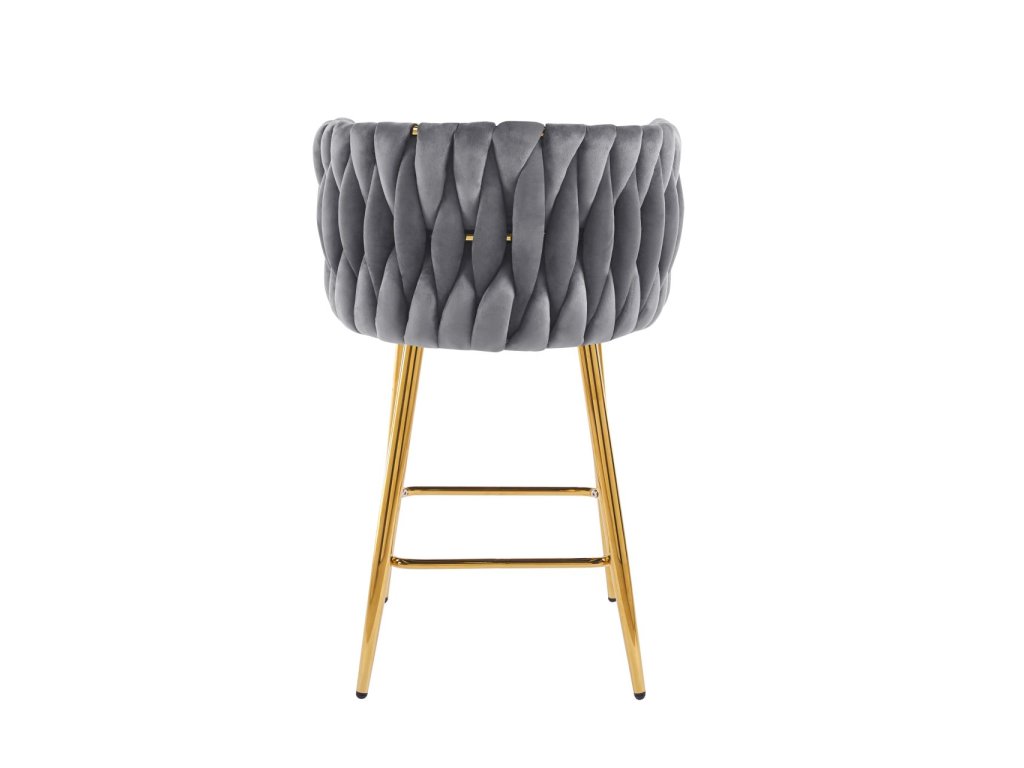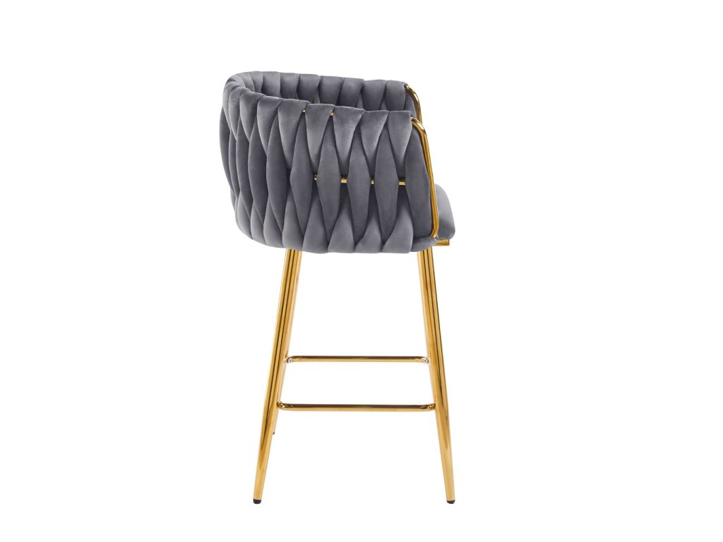 Tato glamour barová židle v elegantní šedé barvě je ideálním doplňkem ke kuchyňskému ostrůvku i barovému pultu, kdy chcete interiéru dodat kultivovaný lesk a komfort. Jemné velurové čalounění působí luxusně a příjemně na dotek, zatímco zlatá chromovaná konstrukce vytváří moderní, prémiový kontrast. Zaoblené opěradlo s dekorativním proplétaným vzorem dodává židli charakter a zároveň poskytuje oporu při sezení.