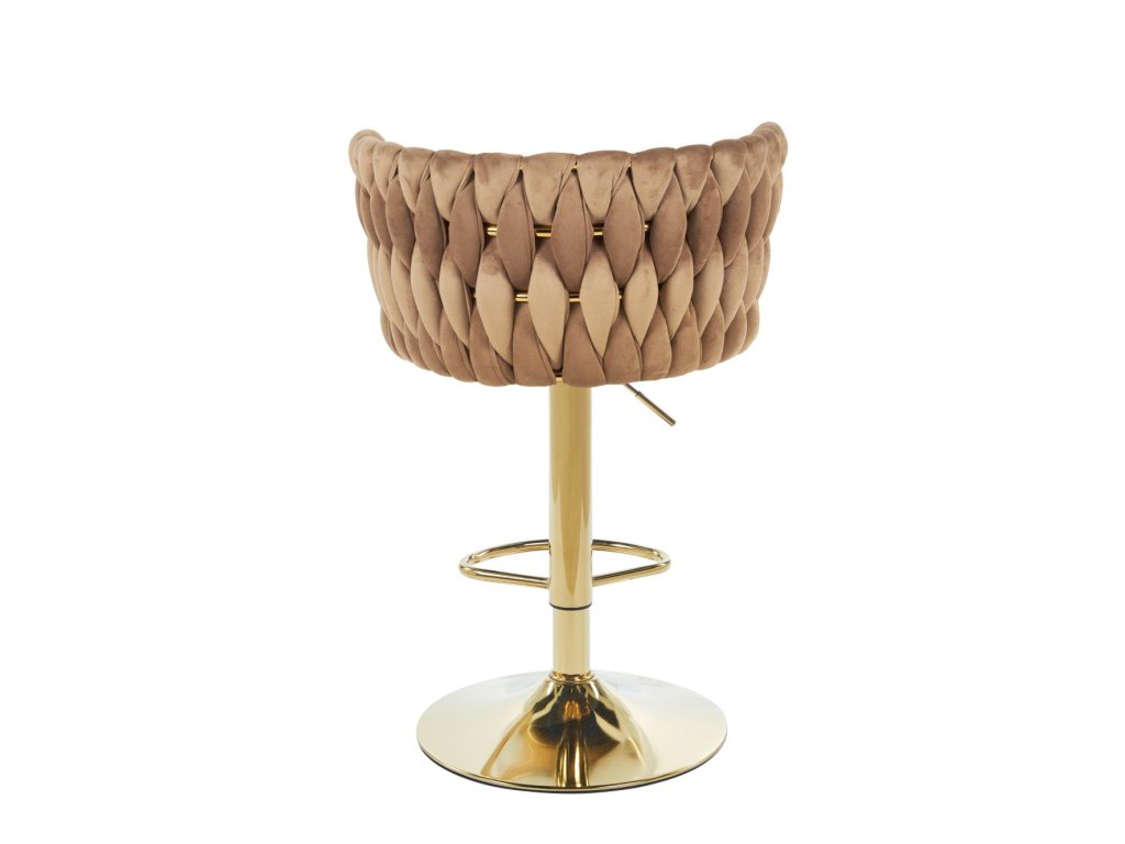 Dominantním prvkem je proplétané opěradlo z měkkého sametového čalounění , které působí jako ručně tvořený designový detail. Jemný lesk sametu mění odstín podle dopadu světla, díky čemuž barová židle získává luxusní a prémiový vzhled.