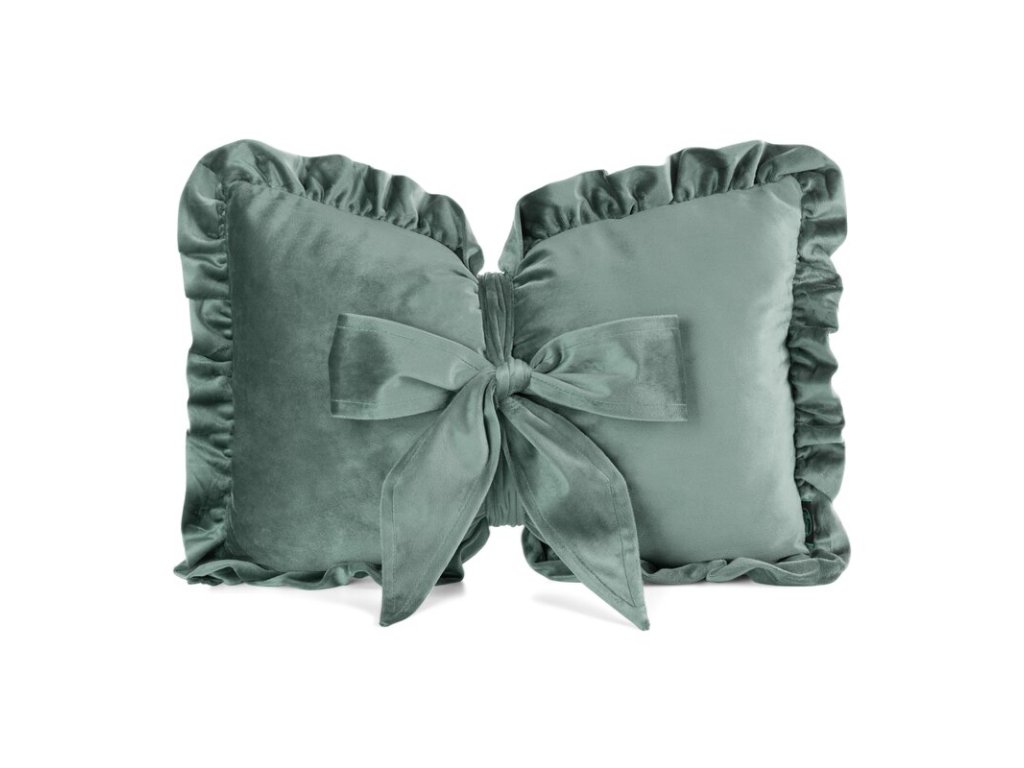 Hebký sametový povrch v přírodním zeleném odstínu působí harmonicky a vkusně, zatímco ozdobný volánek po obvodu a výrazná mašle uprostřed dělají z polštáře jedinečný designový prvek.