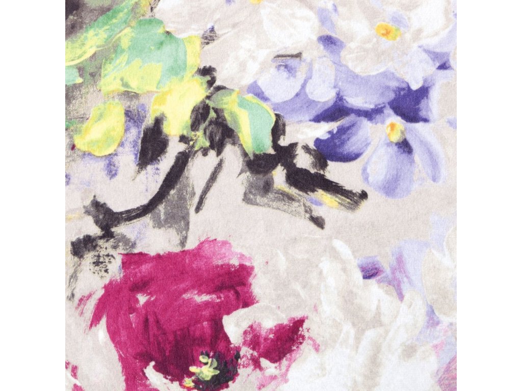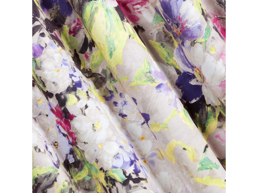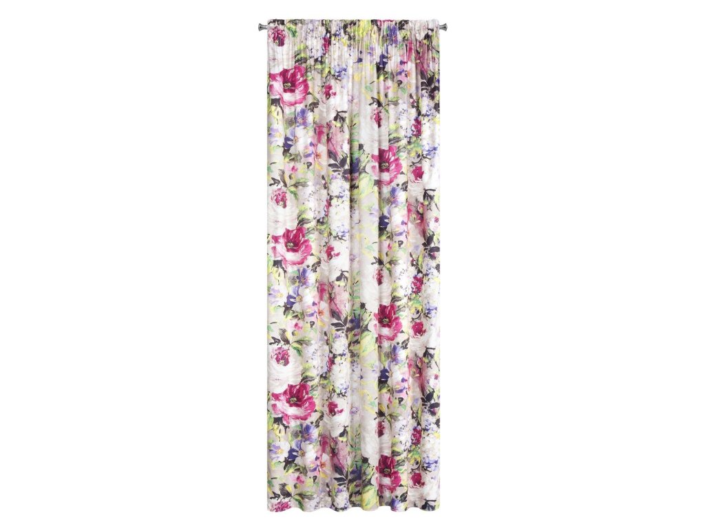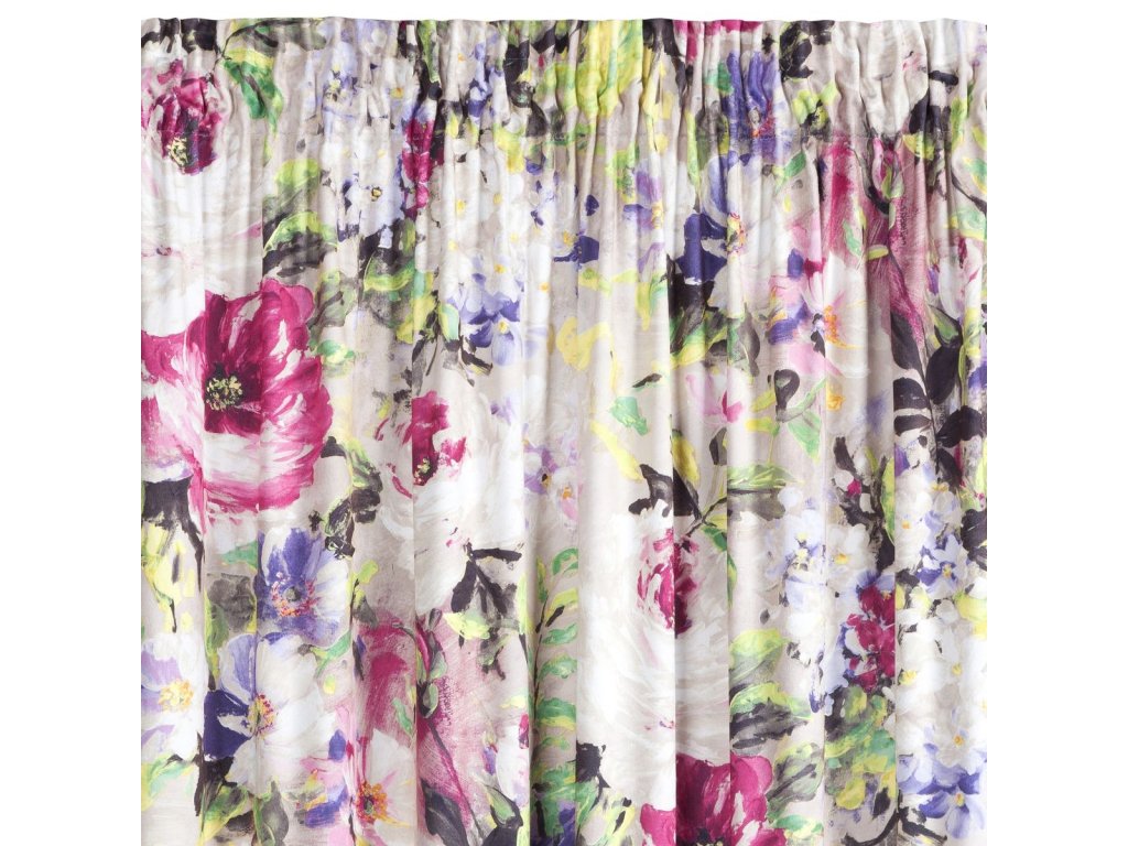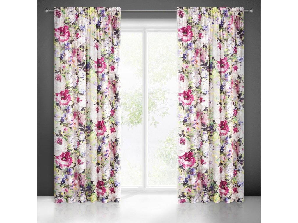 Na dotek jemný závěs z příjemné sametové látky zdobený módním květinovým motivem v pestrých barvách na bílém podkladu, je doplňkem, který se dokonale hodí do moderních i klasických interiérů.
