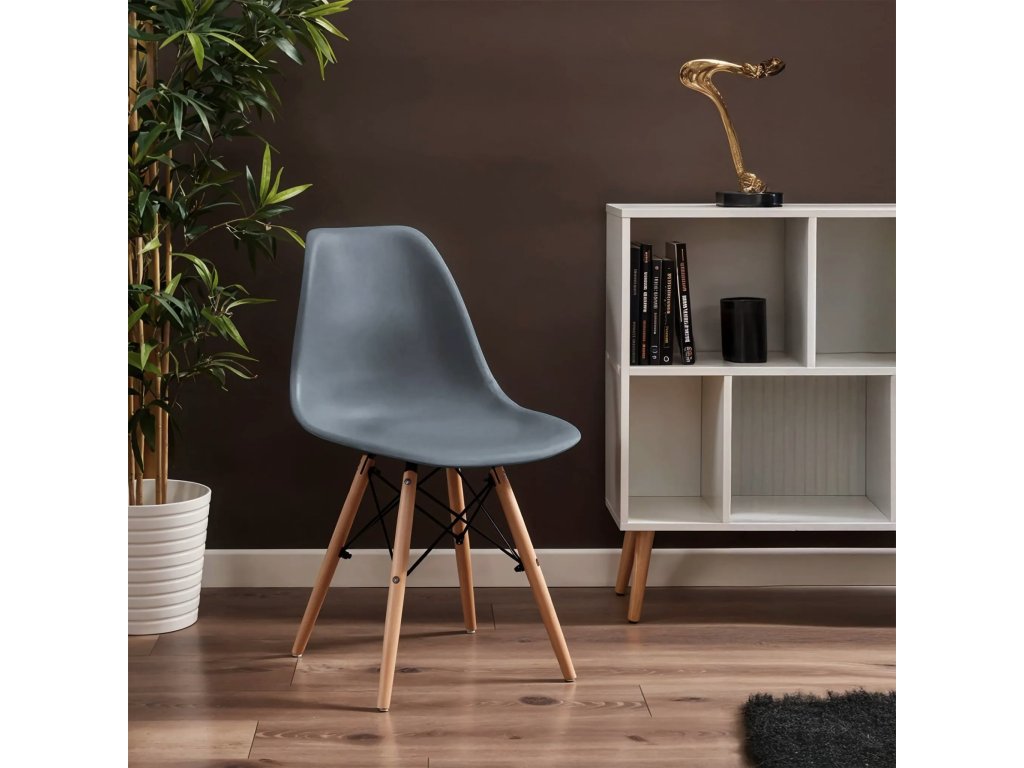 Ergonomicky tvarované sedátko z odolného polypropylenu je navrženo pro pohodlné každodenní sezení. Stabilitu zajišťují nohy z masivního bukového dřeva , které působí přirozeně a zároveň jsou pevné. Charakteristickým detailem jsou kontrastní spojky, které zpevňují konstrukci a zároveň slouží jako designový akcent.