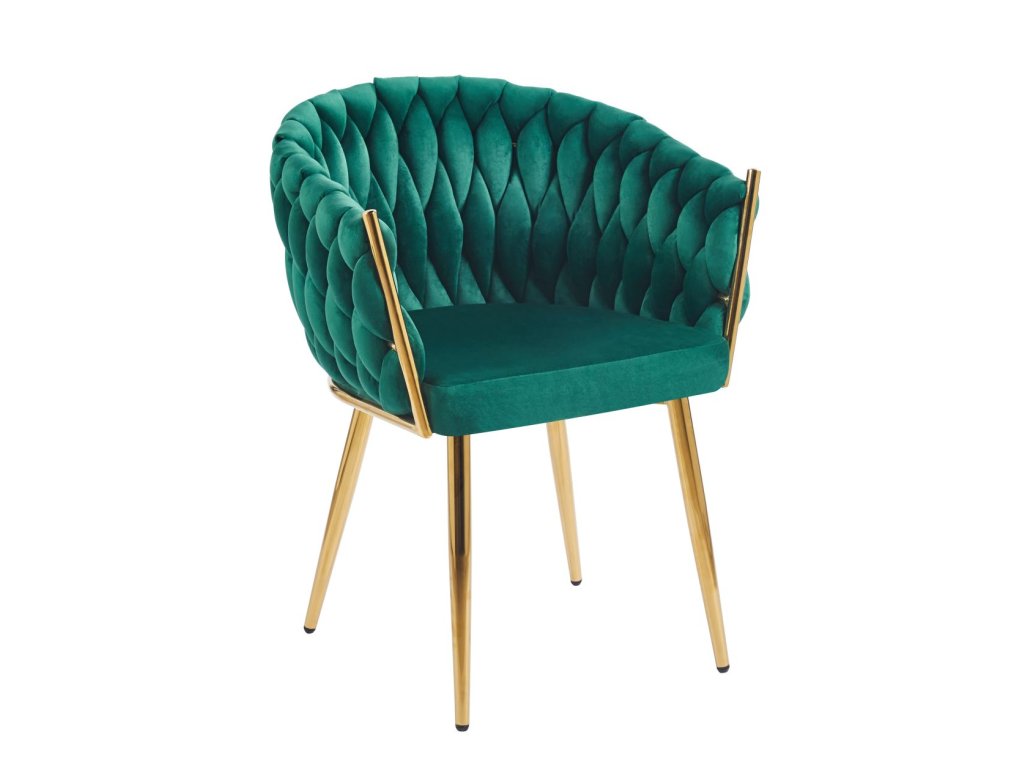 Tato luxusní sametová proplétaná židle je skutečným designovým skvostem, který okamžitě upoutá pozornost a stane se dominantním prvkem vašeho interiéru. Díky originálnímu proplétanému opěradlu, jemnému velvetu a elegantním zlatým nohám židle dokonale zapadne do moderních i glamour interiérů.