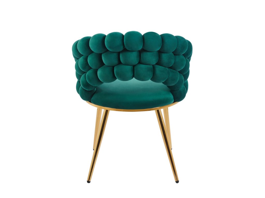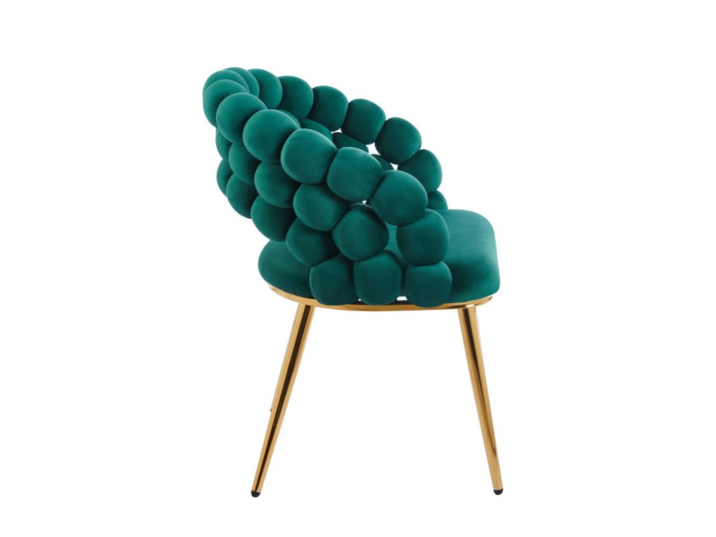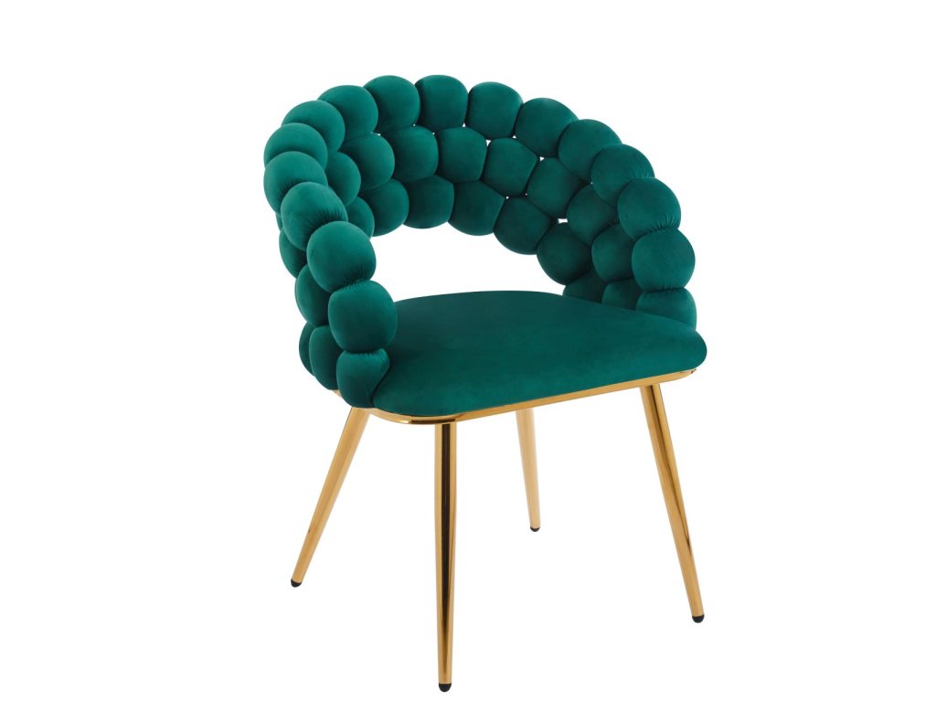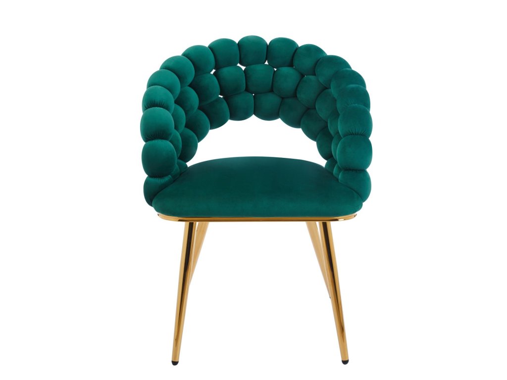 Pevná chromová konstrukce ve zlaté barvě zajišťuje stabilitu, dlouhou životnost a elegantní kontrast k hluboké tmavě zelené barvě sedáku. Ergonomicky tvarované sedátko spolu se zaobleným opěradlem poskytují vysoký komfort sezení, díky čemuž je židle vhodná i pro delší sezení u jídelního nebo pracovního stolu.