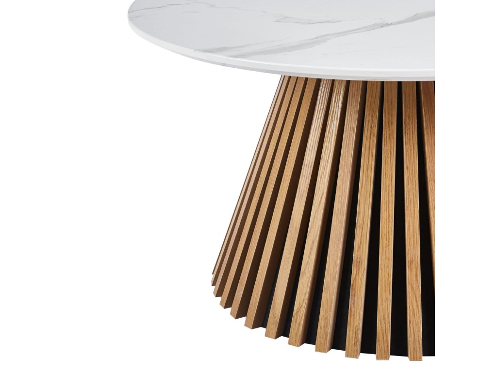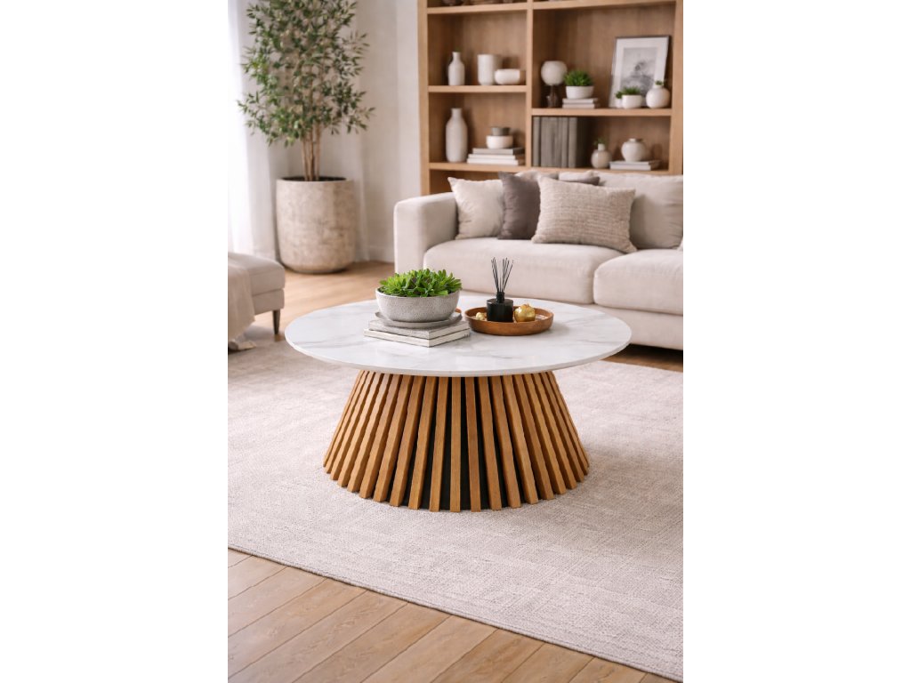 Konferenční stolek Aurio s bílou mramorovou deskou představuje harmonické spojení luxusu, přírodních prvků a moderního designu. Elegantní kulatá deska v dekoru bílého mramoru působí nadčasově a sofistikovaně, zatímco originální podnož z vertikálních dřevěných lamel dodává stolku teplo, charakter a architektonickou hloubku.