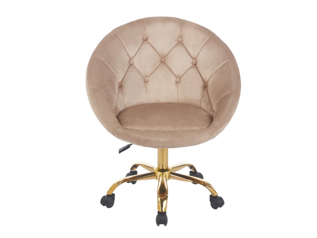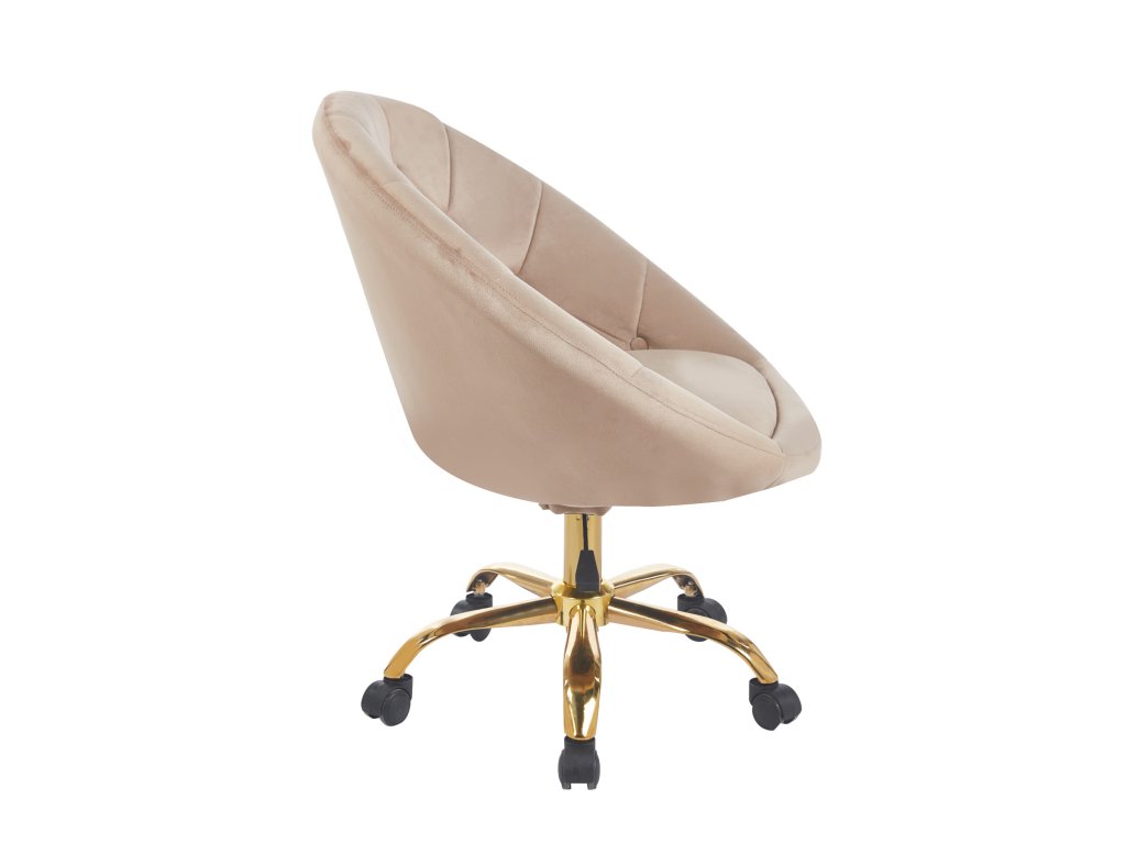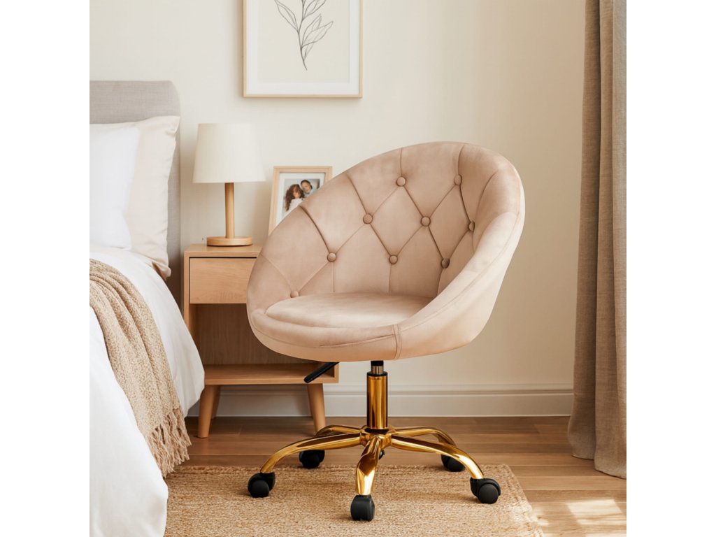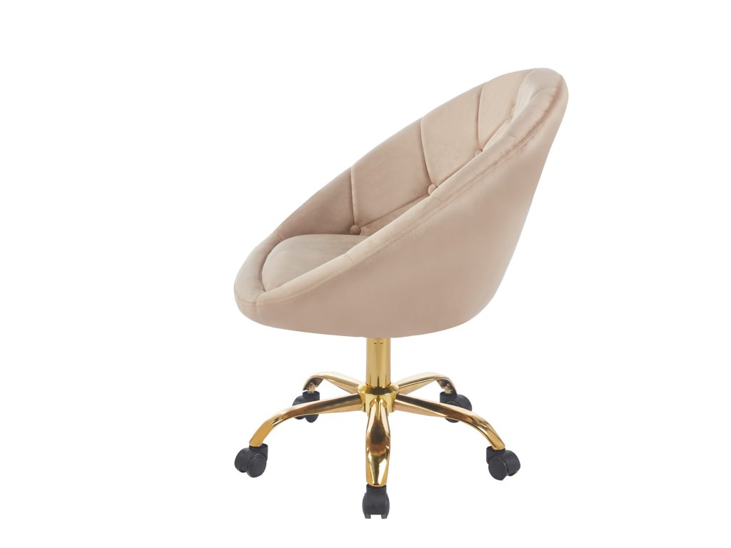 Otočná židle na kolečkách je čalouněna jemným velurem příjemným na dotek a v univerzálním béžovém odstínu působí nadčasově a elegantně.