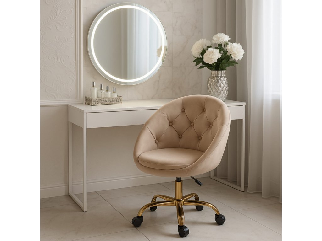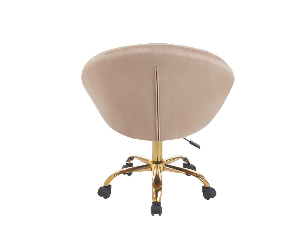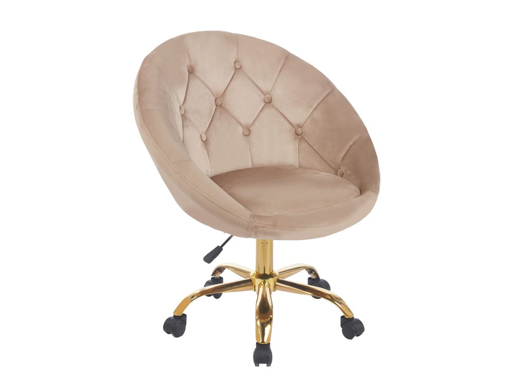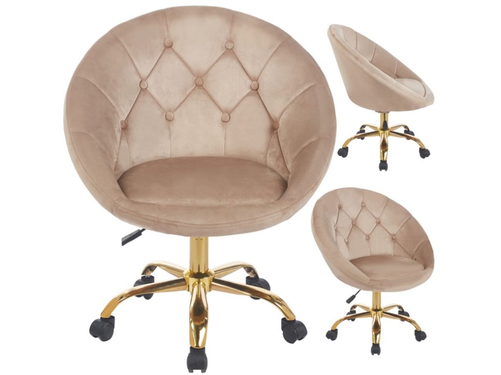 Otočná židle na kolečkách je čalouněna jemným velurem příjemným na dotek a v univerzálním béžovém odstínu působí nadčasově a elegantně.