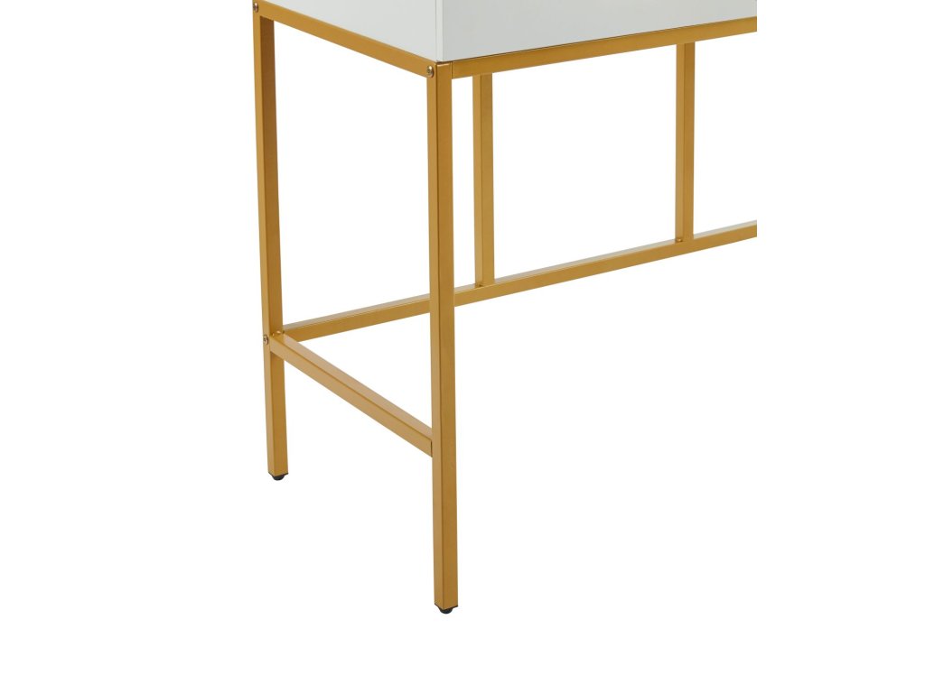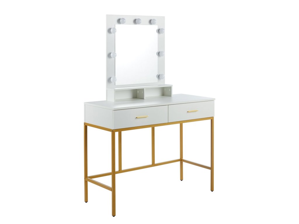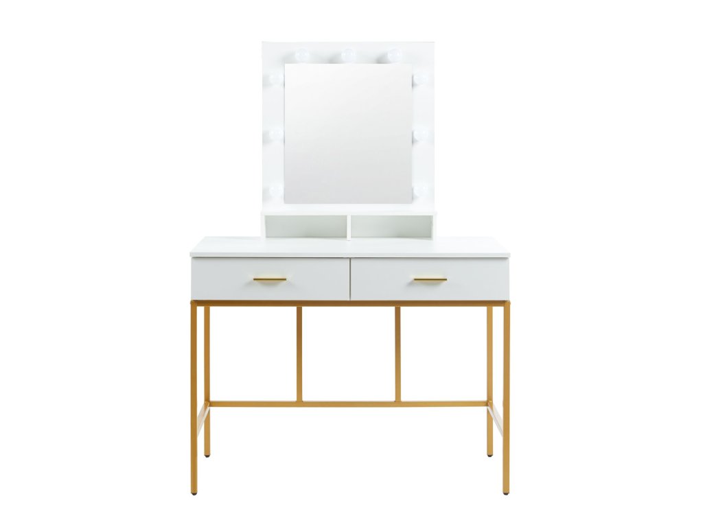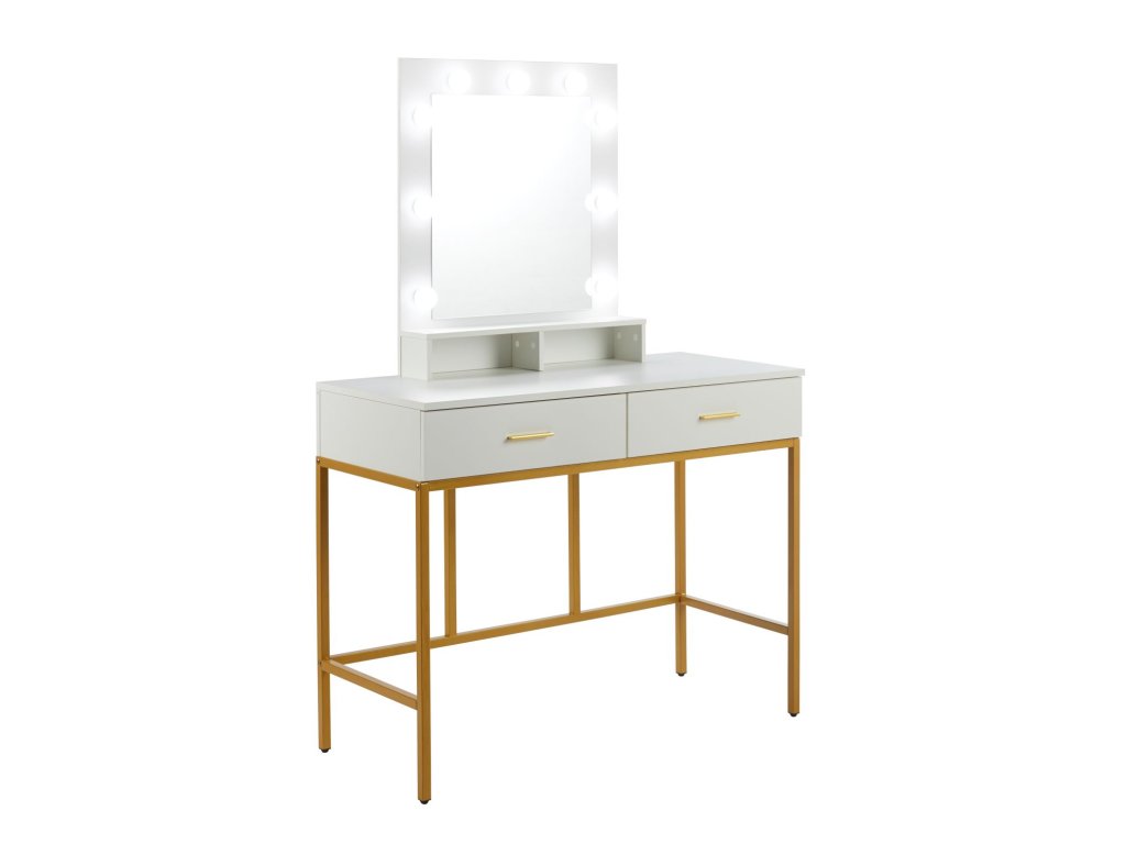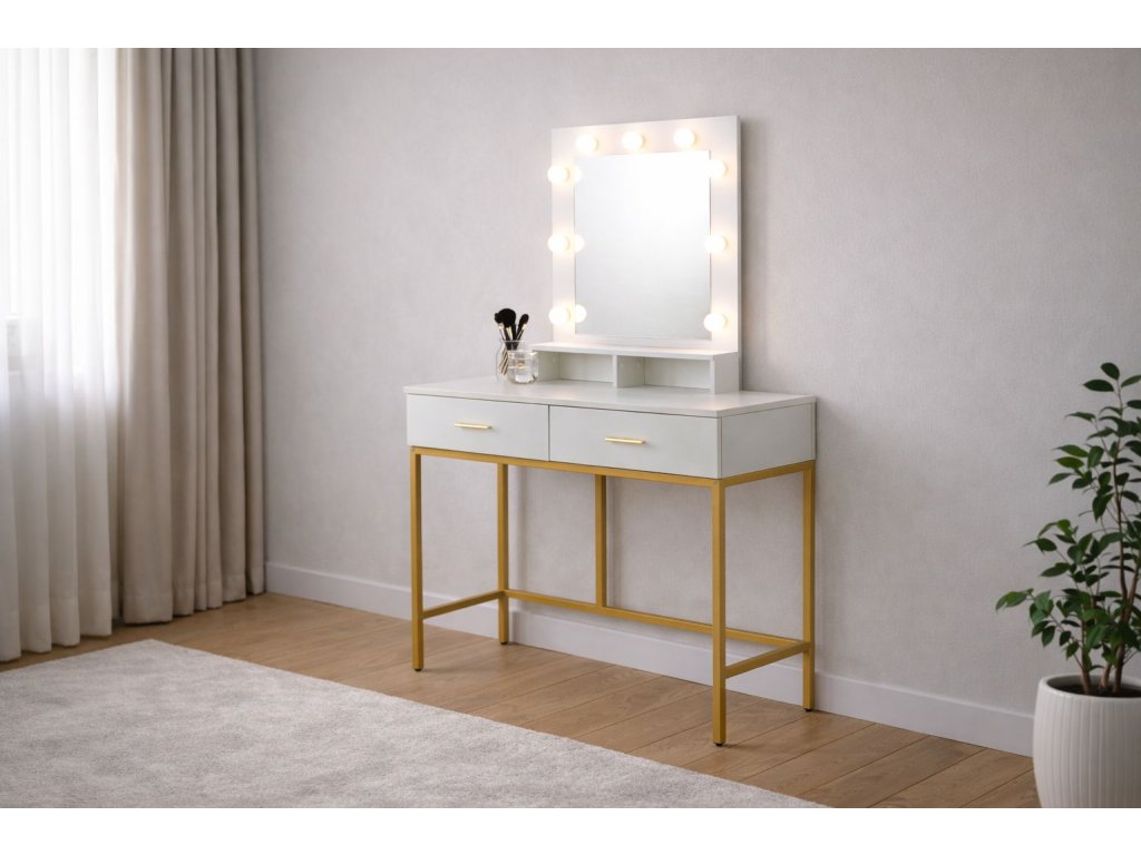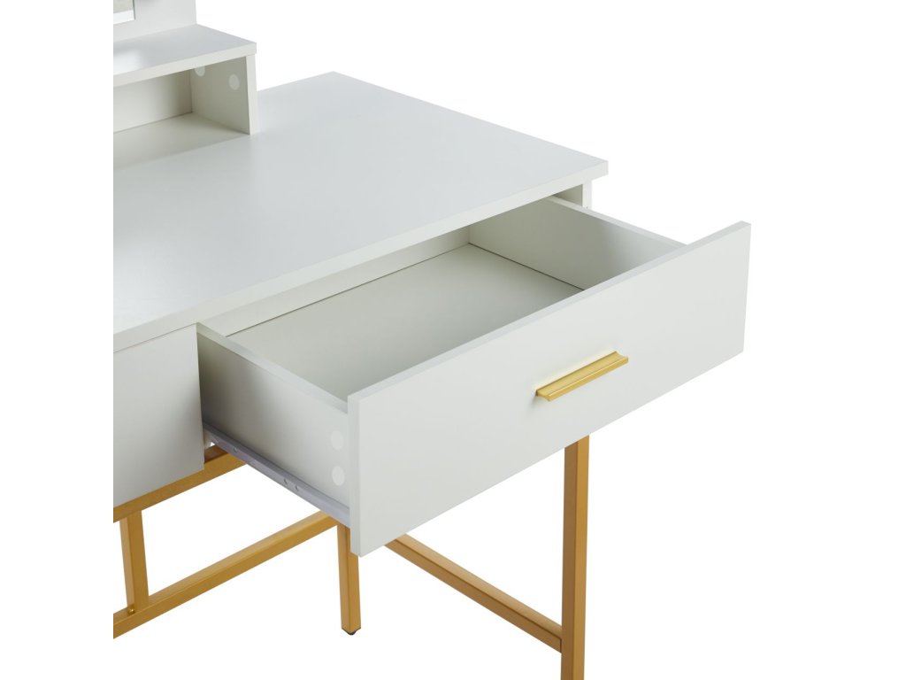 Stabilní kovová konstrukce ve zlatém provedení dodává stolku lehkost i pevnost, zatímco bílá laminovaná deska se snadno udržuje a je odolná vůči běžnému používání. Toaletní stolek LUMIÈRE GOLD se stane nejen funkčním kusem nábytku, ale také výrazným designovým prvkem vaší ložnice či šatny.
