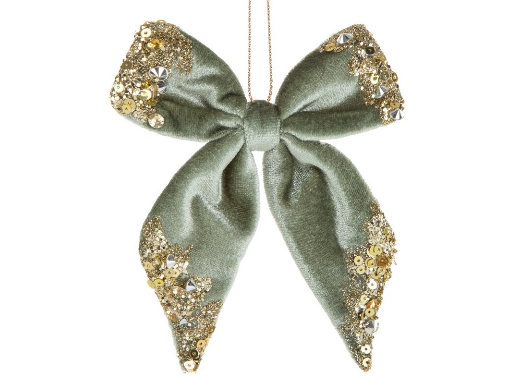 Elegantní vánoční mašle v mátové barvě s luxusními detaily ze zlatých třpytek, flitrů a kamínků dodá vaší výzdobě nádech noblesy.