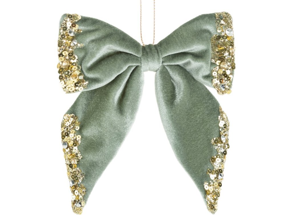 Elegantní vánoční mašle v mátové barvě s luxusními detaily ze zlatých třpytek, flitrů a kamínků dodá vaší výzdobě nádech noblesy.