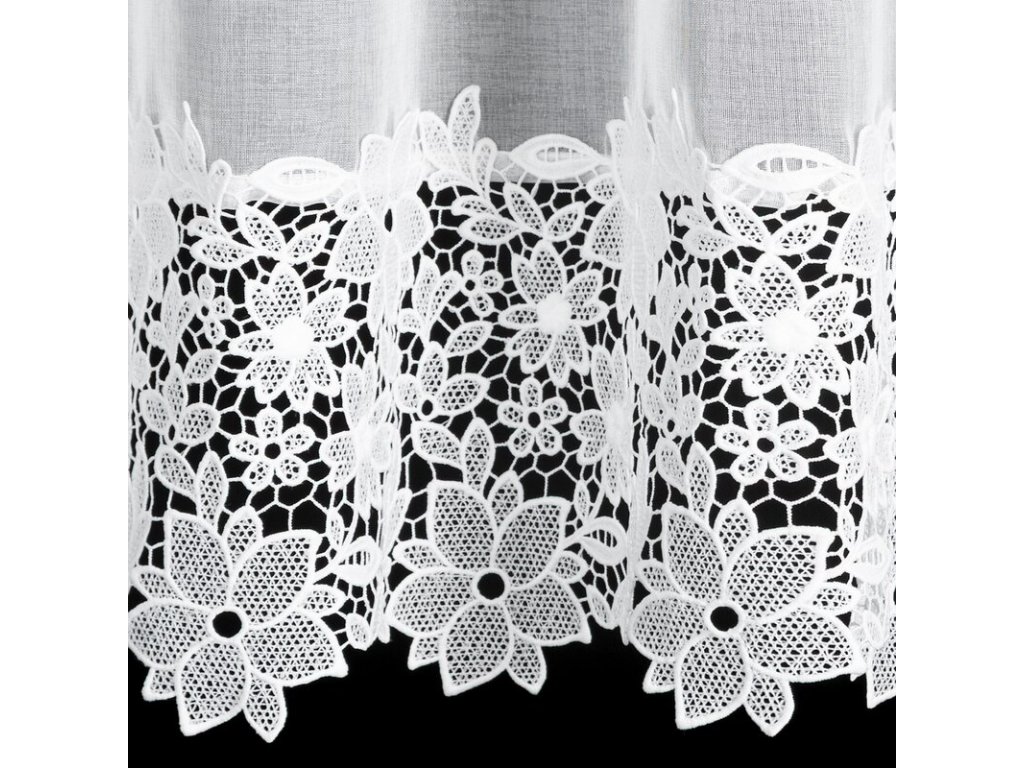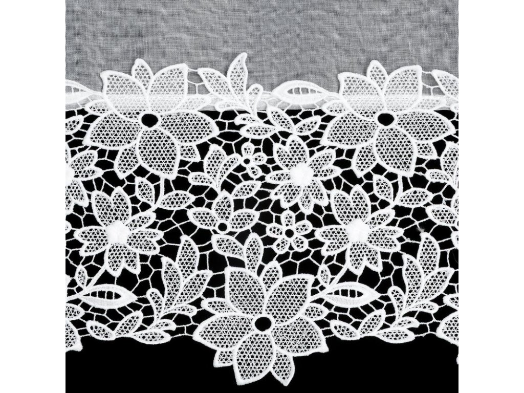Lehká, vzdušná látka v kombinaci s dekorativním krajkovým pásem vytváří harmonický celek, který do interiéru přináší světlo, lehkost a sofistikovaný detail. Transparentní materiál propouští přirozené denní světlo, ale zároveň zjemňuje pohled do místnosti a vytváří příjemnou atmosféru soukromí.