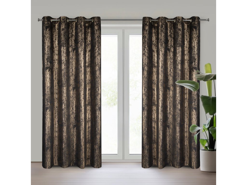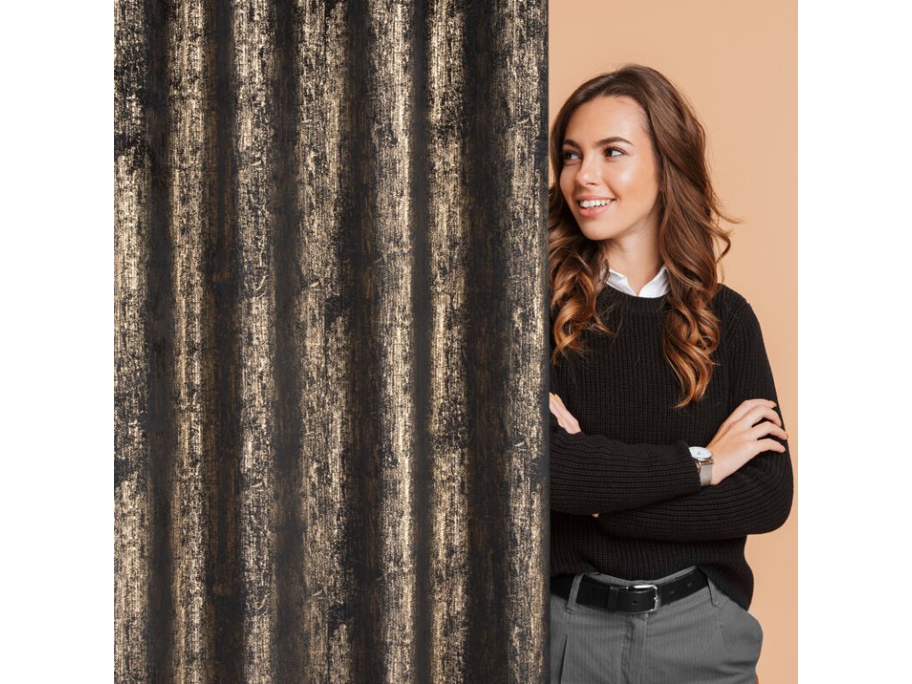Zlaté vzory elegantně odrážejí světlo, díky čemuž závěs působí zářivě a vytváří útulnou, náladovou atmosféru během dne i večeře. Díky praktickým zlatým kovovým očkám se závěs jednoduše zavěsí a lehce posouvá po tyči – látka se přirozeně tvaruje do měkkých, rovnoměrných záhybů.