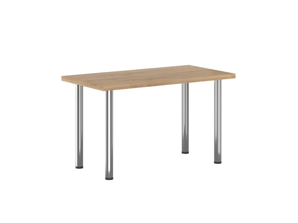 Moderní jídelní stůl o rozměrech 128×67 cm představuje dokonalou kombinaci elegance a funkčnosti. Laminátová deska v dekoru zlatého dubu dodává interiéru teplo a přirozenost, zatímco chromové nohy zajišťují moderní design a stabilitu.