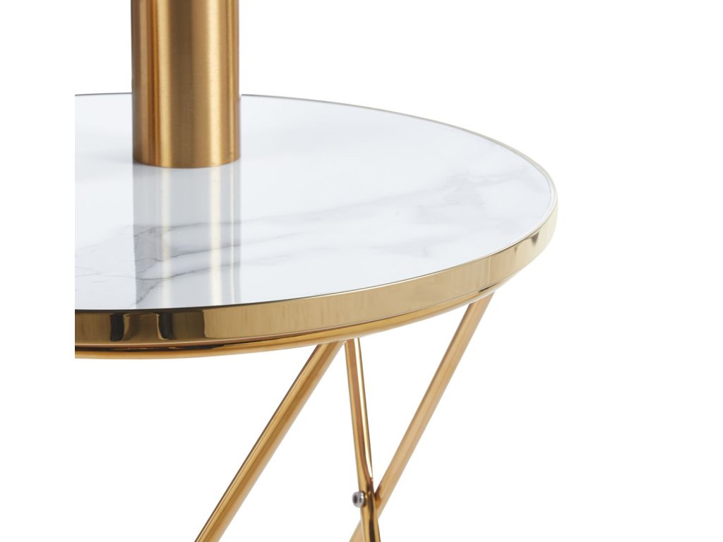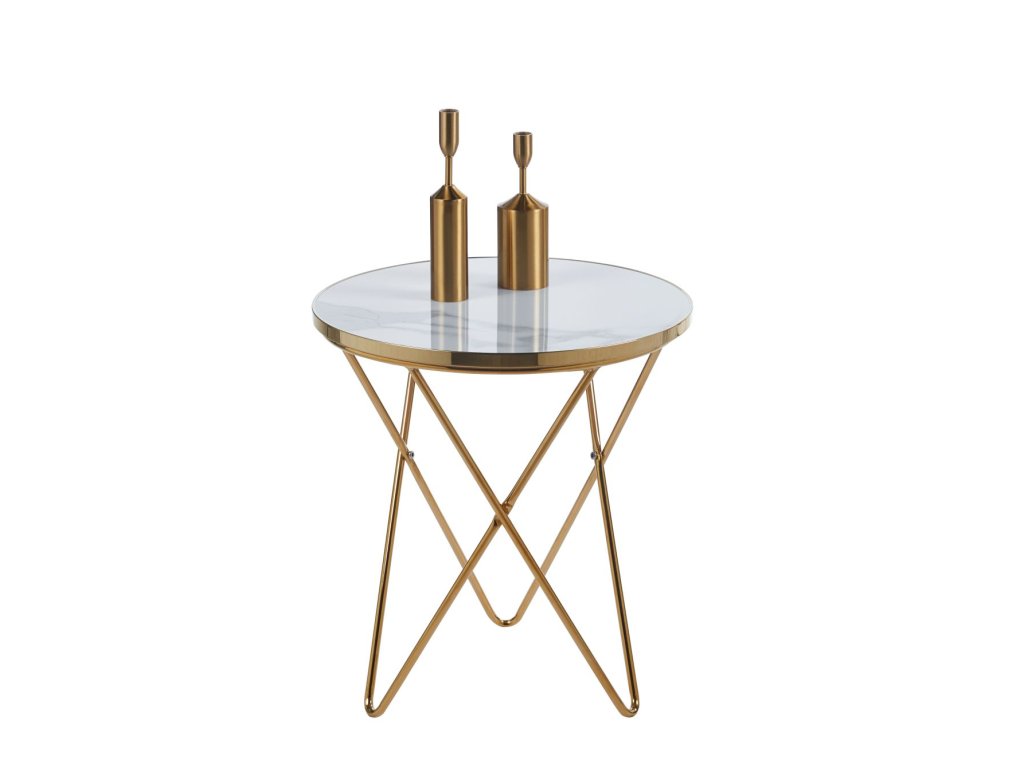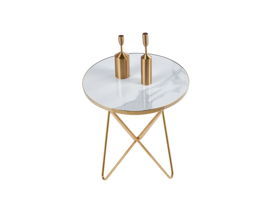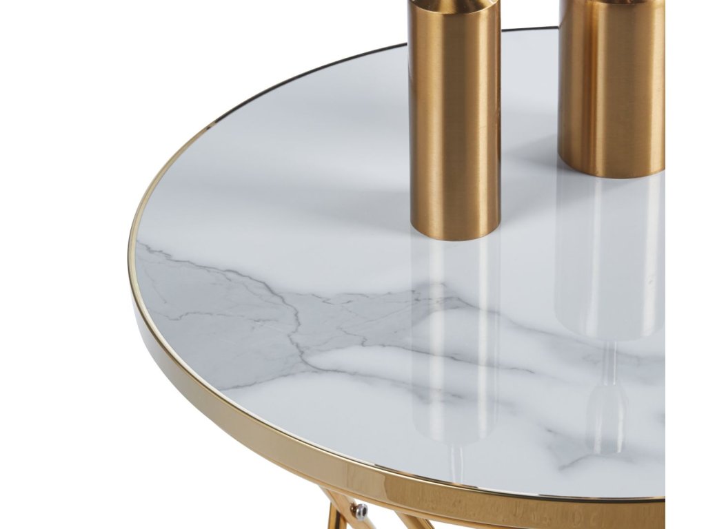 Stolek má kulatý akrylový vrch v provedení bílý mramor , který je odolný, snadno se čistí a působí mimořádně esteticky. Stabilní podstava ze zlatého chromovaného kovu vytváří geometrickou konstrukci, která dodává stolku luxusní a jedinečný vzhled.