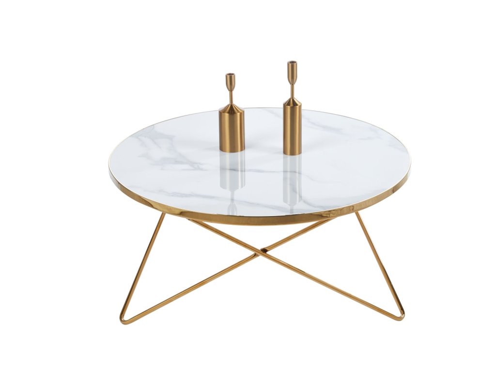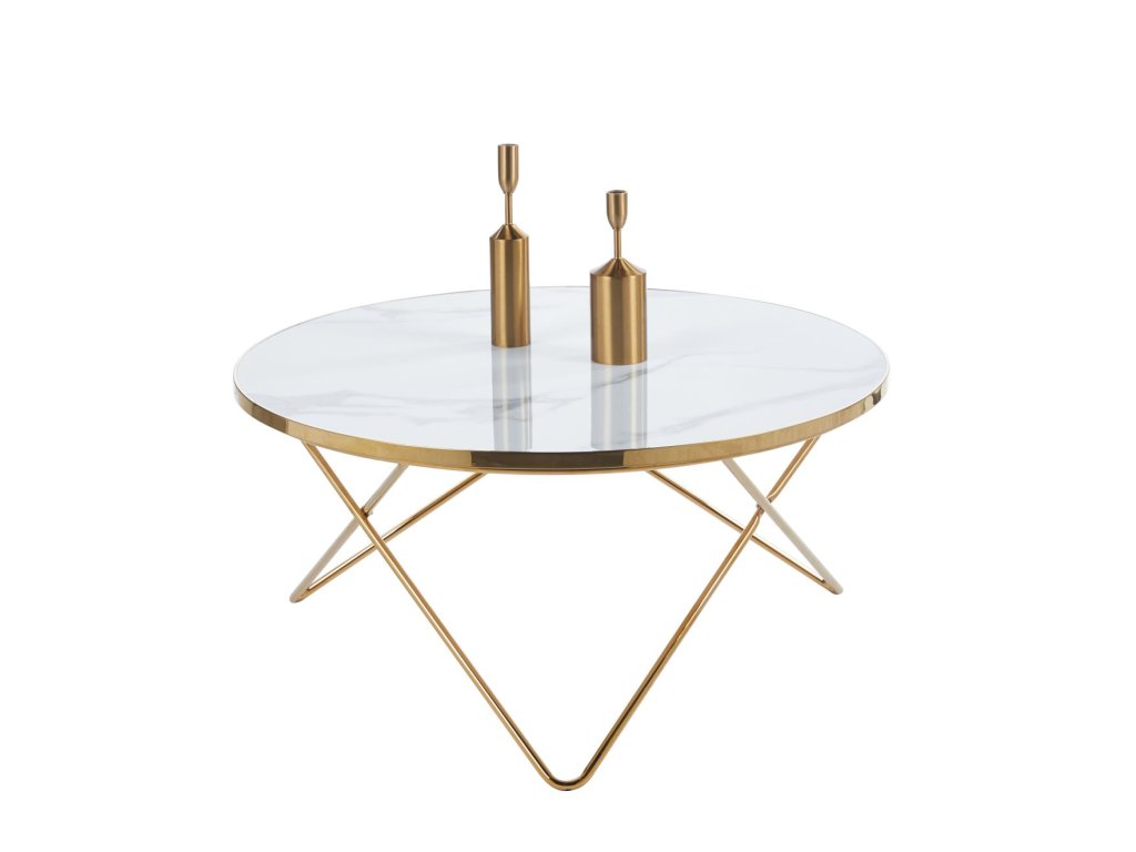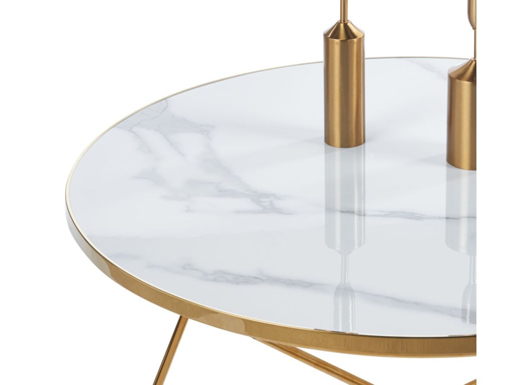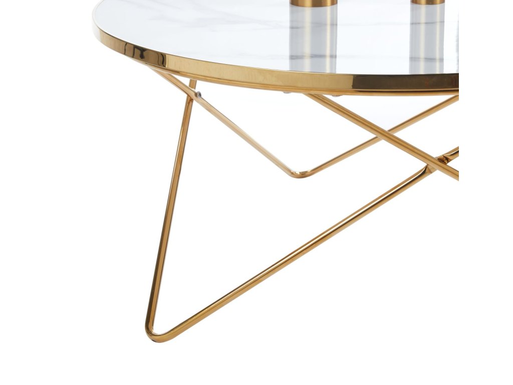 Stolek má kulatý akrylový vrch v provedení bílý mramor , který je odolný, snadno se čistí a působí mimořádně esteticky. Stabilní podstava ze zlatého chromovaného kovu vytváří geometrickou konstrukci, která dodává stolku luxusní a jedinečný vzhled.