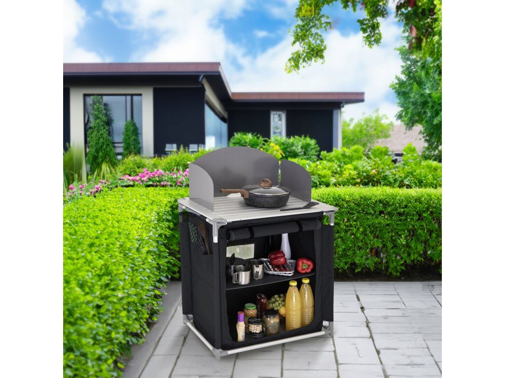 Kempingová skládací skříňka se stolkem a kovovým varným povrchem - černá