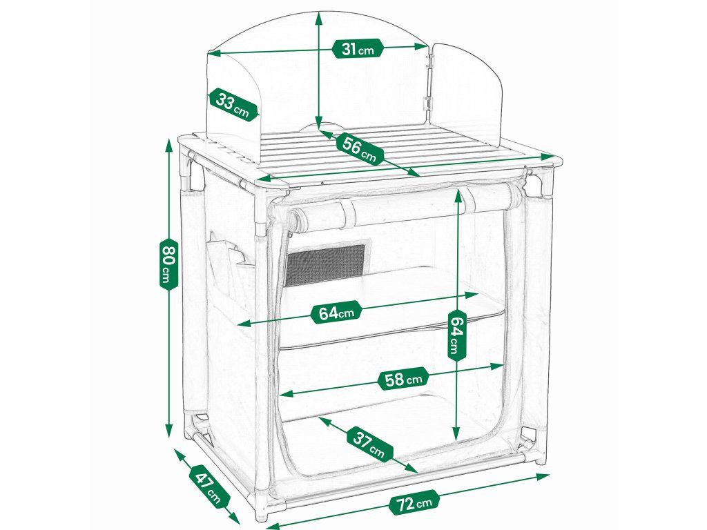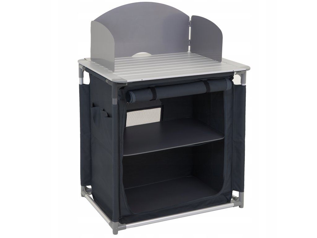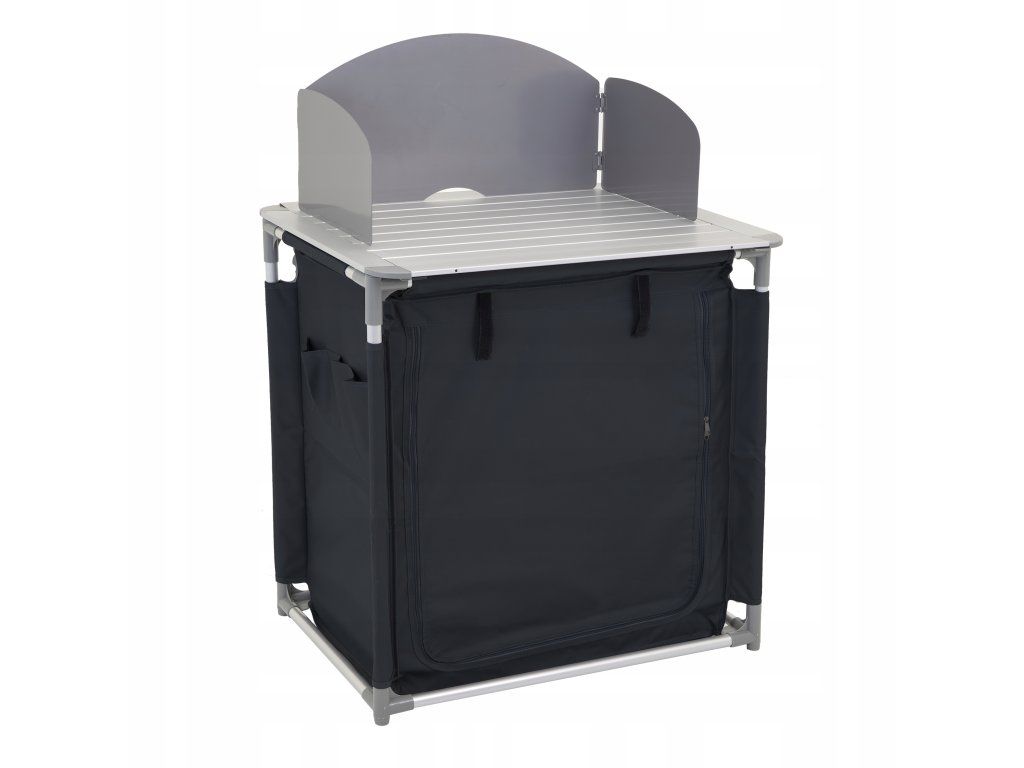 Tato skládací kempinková kuchyně spojuje kovový pracovní povrch vhodný pro plynový vařič se závěsnou skříňkou, která poskytuje reálný úložný prostor pro potraviny, nádobí i drobné příslušenství.