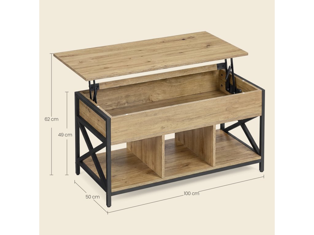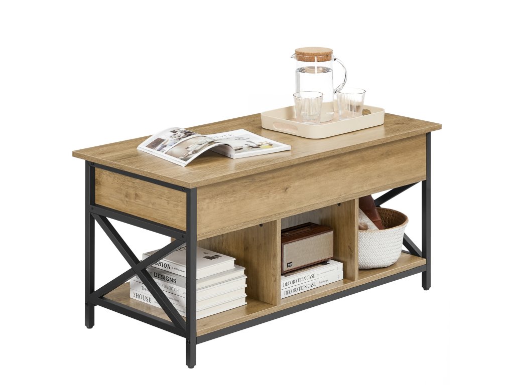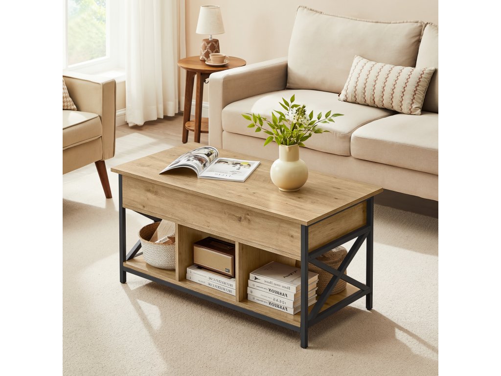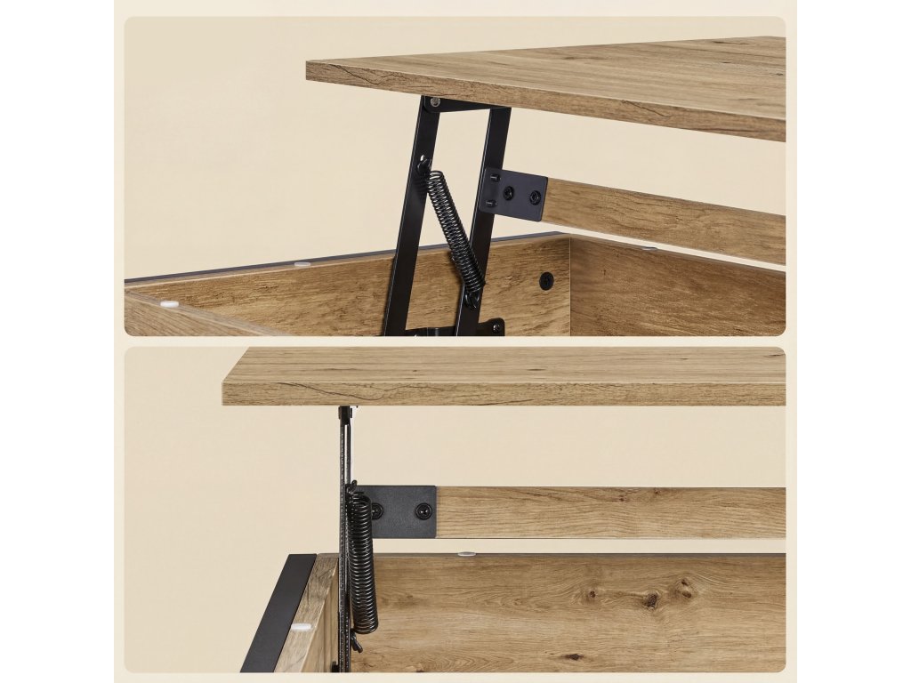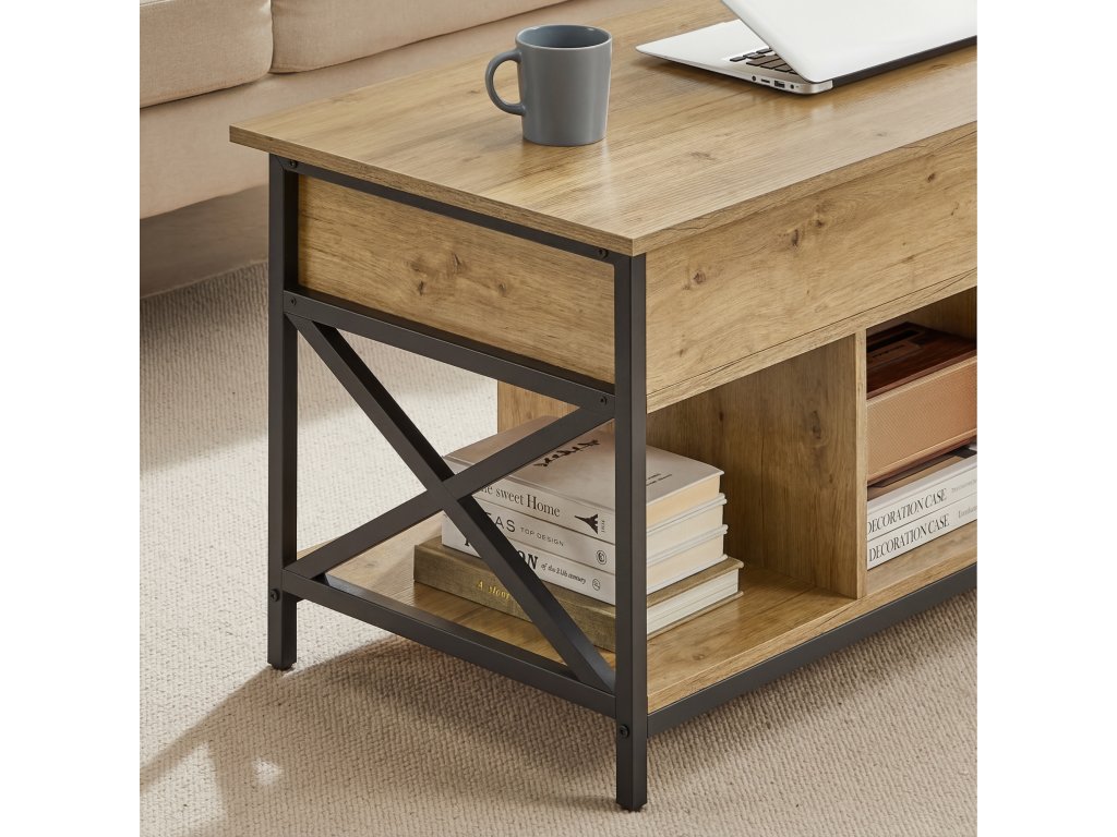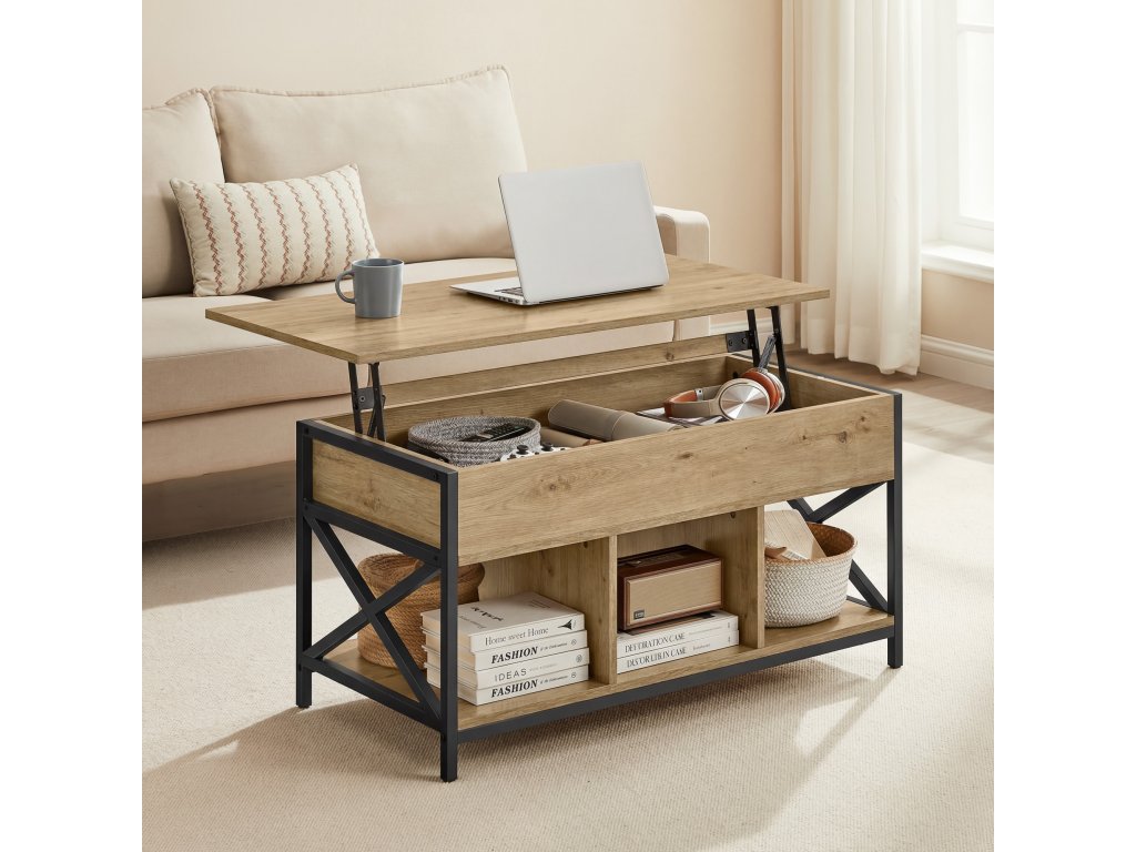 Hlavní předností stolku je výklopná/výsuvná horní deska , díky které se výška stolku mění z 49 cm na 62 cm. Tento mechanismus umožňuje pohodlné používání při práci s notebookem, pojídání nebo odpočinku na pohovce. Pod horní deskou se nachází praktický úložný prostor , ideální na ovladače, časopisy, knihy či drobnosti, které chcete mít vždy po ruce, ale zároveň skryté.