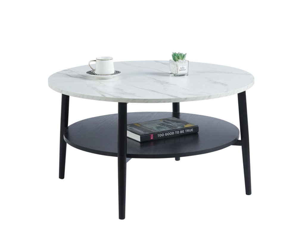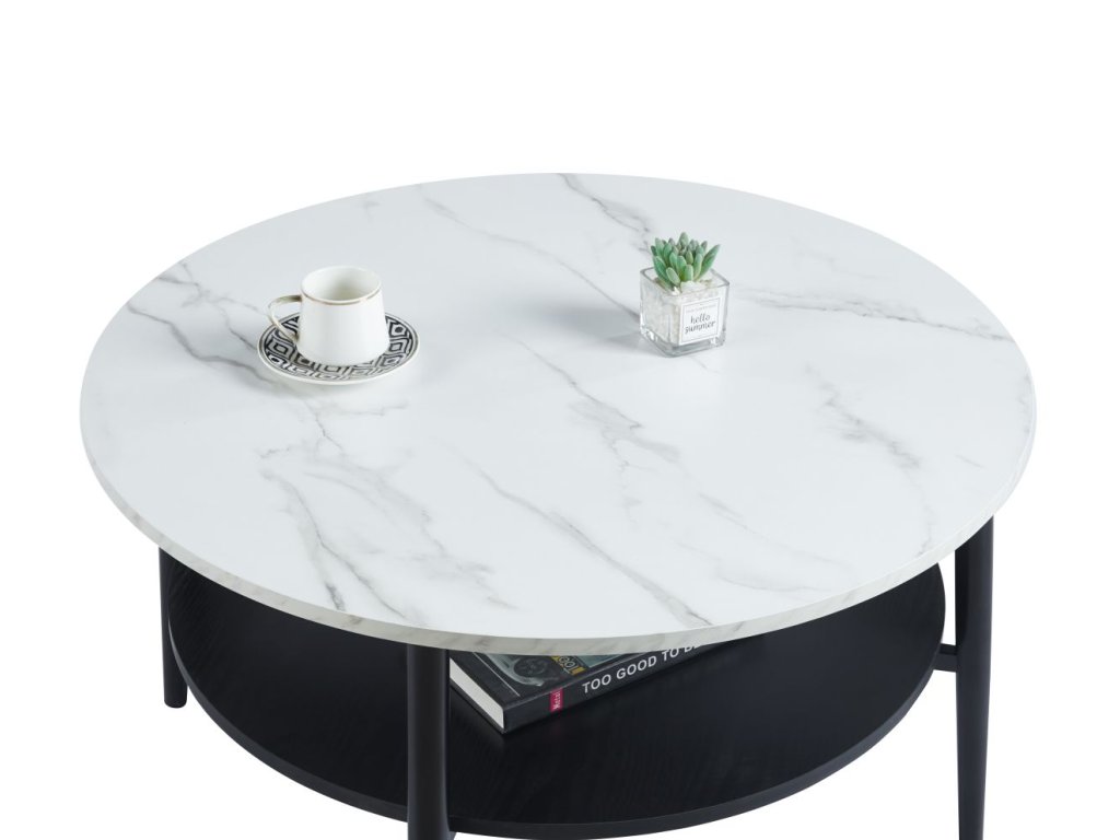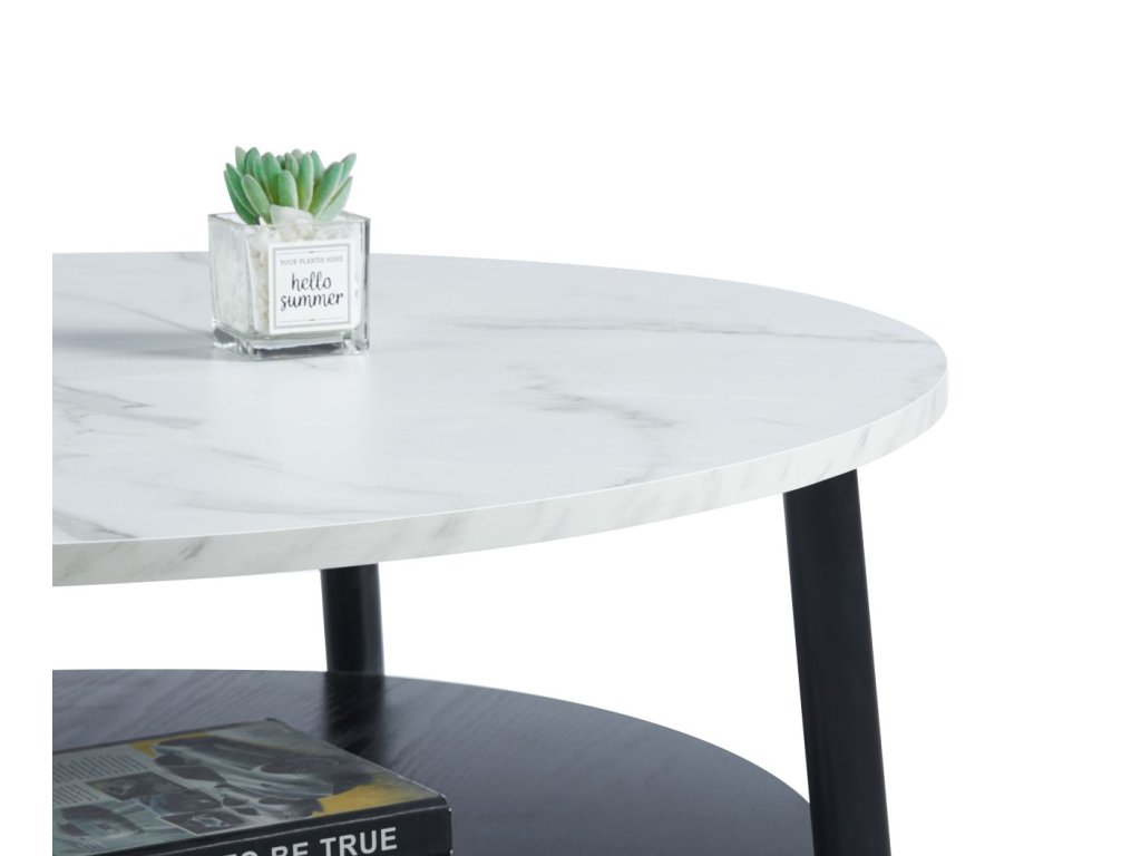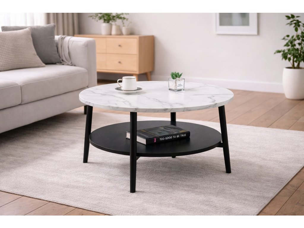 Díky dvouúrovňovému řešení nabízí stolek dostatek prostoru pro každodenní používání. Horní deska je ideální pro kávu, dekorace či občerstvení, zatímco spodní police v černém provedení poskytuje praktický úložný prostor pro knihy, časopisy nebo ovladače. Kulatý tvar zároveň zjemňuje interiér a umožňuje pohodlné umístění i do menších obýváků.