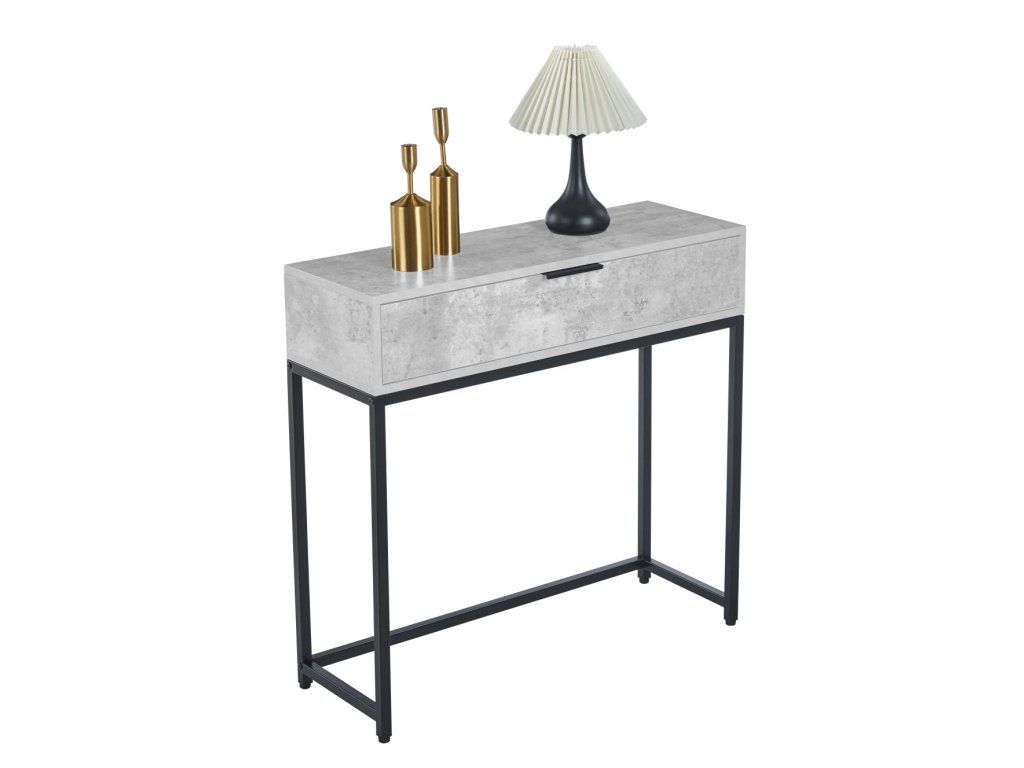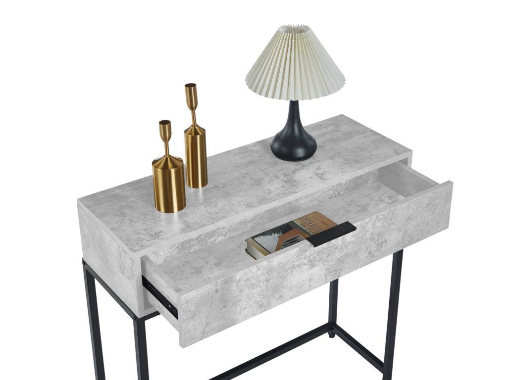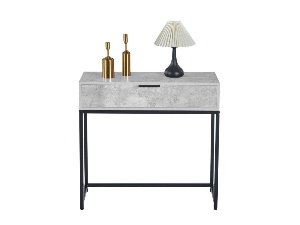 Rozměrově kompaktní stolek o rozměrech 80×28×77 cm je ideální do menších prostor, přičemž praktická zásuvka poskytuje úložný prostor pro drobné předměty. Díky svému designu perfektně doplní moderní i industriální interiéry.