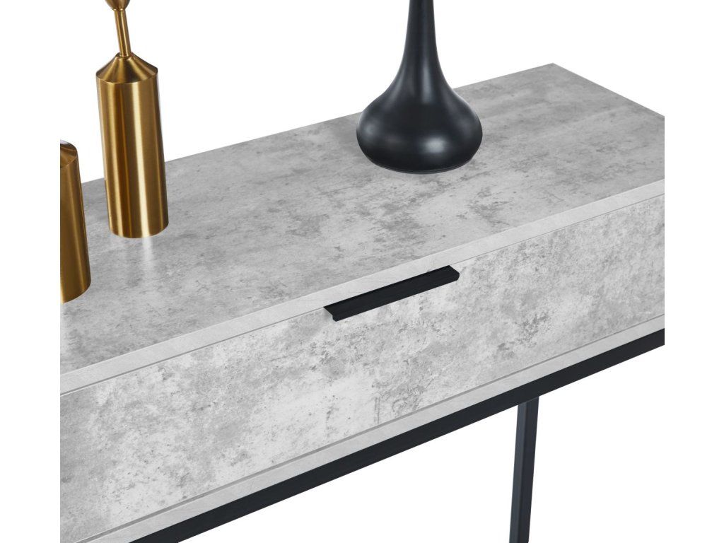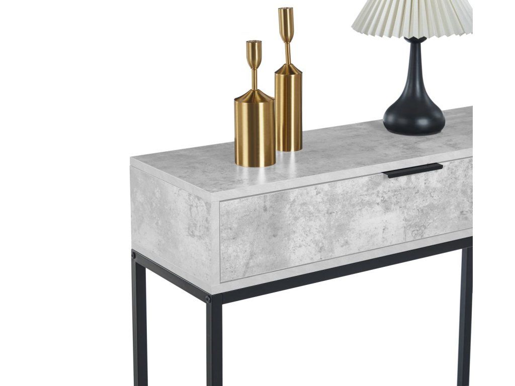 Konzolový stolek v betonovém dekoru je ideální pro milovníky industriálního a moderního stylu. Kombinujte jej s kovovými doplňky a přírodní zelení pro dokonalý vzhled. Perfektní řešení pro předsíň, obývací pokoj nebo jako pracovní stolek.