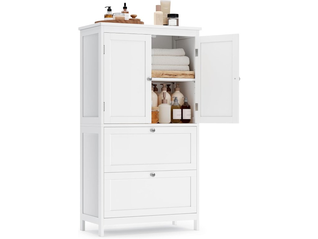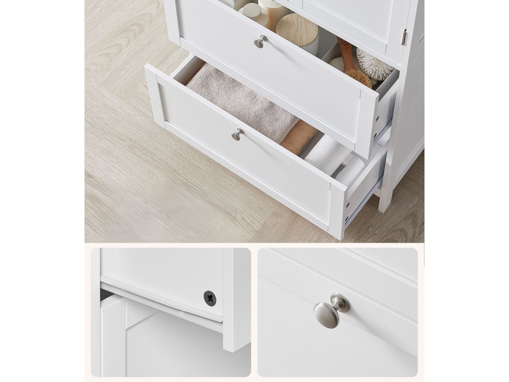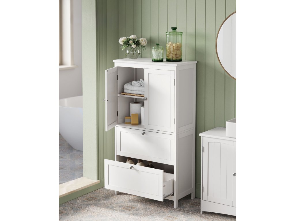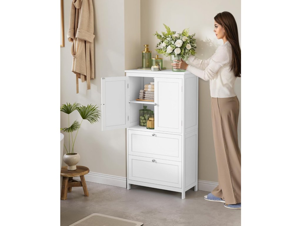 Moderní volně stojící koupelnová skříňka v bílé barvě je praktickým a zároveň elegantním řešením pro organizaci vaší domácnosti. Díky svému čistému designu a neutrální barevnosti se snadno přizpůsobí různým stylům interiéru – od moderního, přes skandinávský až po minimalistický.