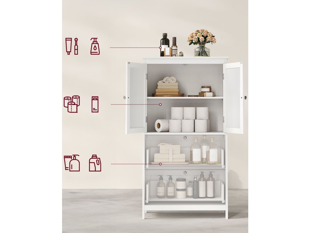 Skříňka nabízí dostatek úložného prostoru na ručníky, kosmetiku, hygienické potřeby či koupelnové doplňky . Uzavřený úložný prostor vám umožní skrýt věci, které nechcete mít na očích, jako například zásoby toaletního papíru nebo čistící prostředky.