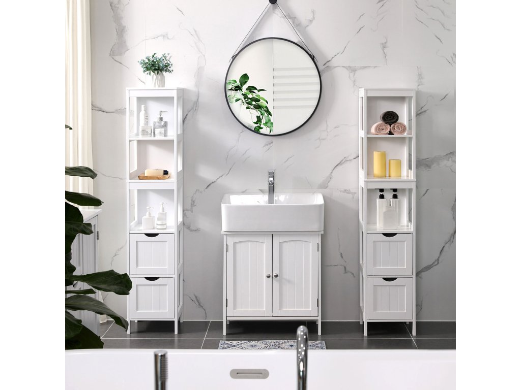 Skříňka je vybavena dvěma hlubokými zásuvkami , které umožňují přehledné uložení ručníků, kosmetiky, koupelnových doplňků nebo zásob, které nechcete mít na očích – například toaletního papíru či čistících prostředků. Zásuvky jsou vyjímatelné a variabilně umístitelné , takže si jejich konfiguraci můžete přizpůsobit vlastním potřebám.