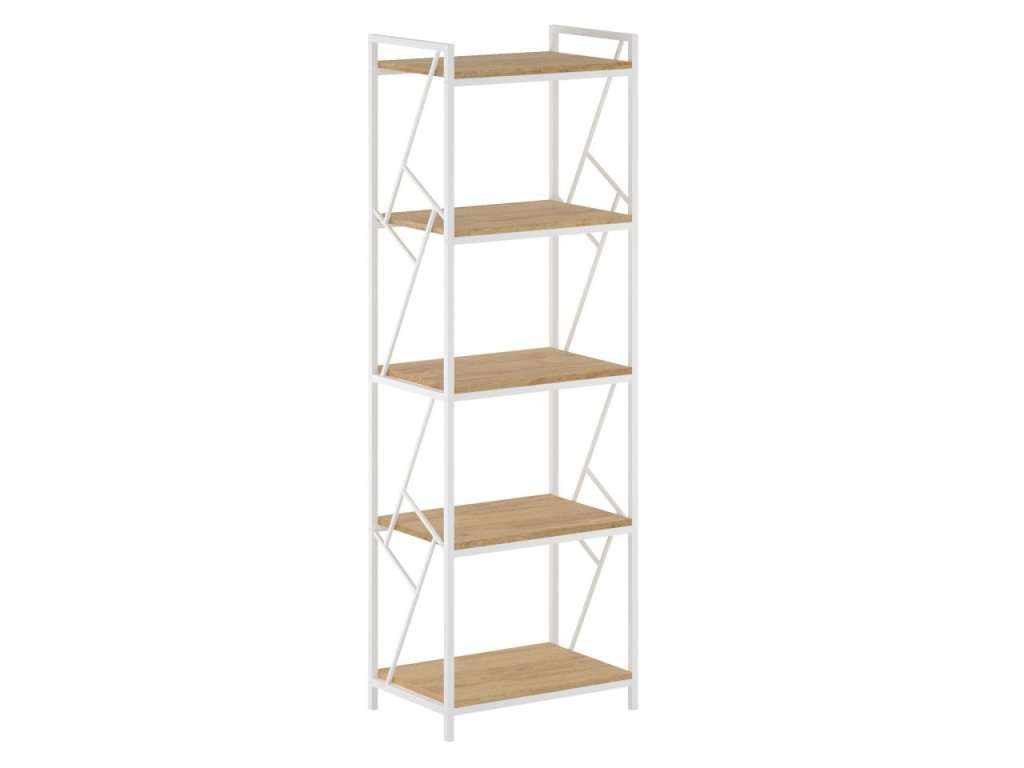 Moderní regál R2-FX s 5 policemi představuje ideální řešení pro organizaci prostoru ve vašem interiéru. Kombinace přírodního dekoru dubu s čistým bílým kovovým rámem vytváří harmonický vzhled, který se hodí do různých stylů zařízení. Police z laminované desky zabezpečují dostatečný úložný prostor pro knihy, dekorace či osobní předměty.