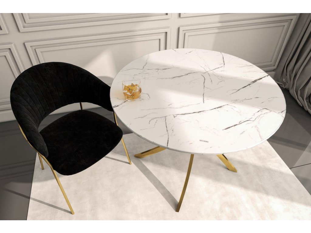 Tento luxusní kulatý jídelní stůl v atraktivní kombinaci bílého mramorového efektu a zlatých kovových nohou je dokonalým doplňkem pro moderní, glamour a elegantní interiéry. Díky svému výraznému designu se stane dominantou jídelny či kuchyně a dodá prostoru nádech luxusu a exkluzivity.