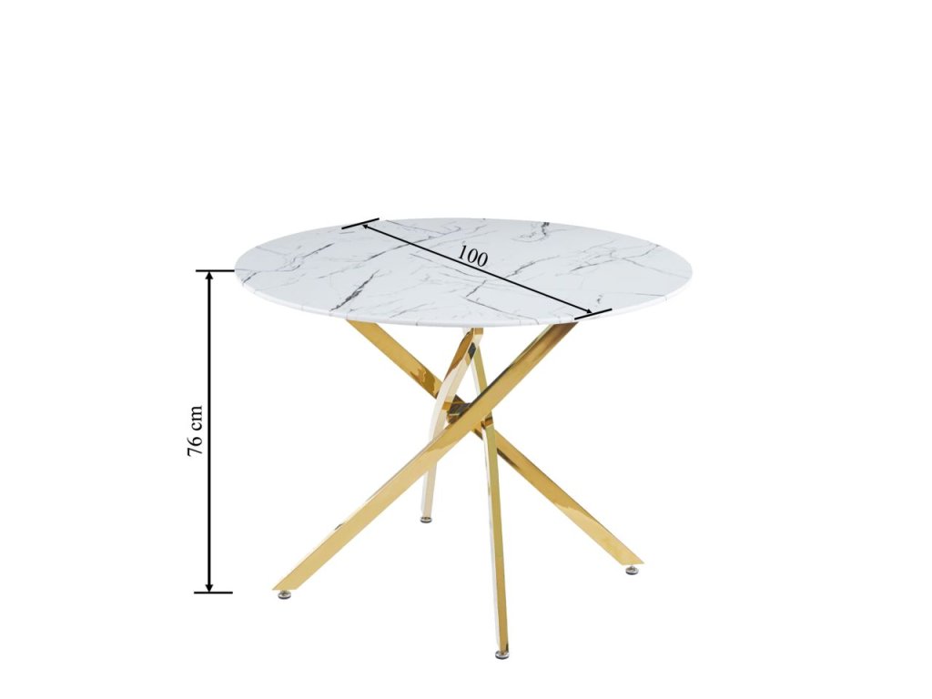 Vrchní deska je vyrobena z kvalitního tvrzeného skla , které je odolné, snadno se udržuje a zároveň působí mimořádně stylově. Mramorový dekor v bílé barvě dodává stolové desce hloubku a výrazný vizuální efekt. Stabilní základnu tvoří chromované ocelové nohy ve zlaté barvě , jejichž moderní křížené provedení dodává stolu výjimečný vzhled a vysokou stabilitu.