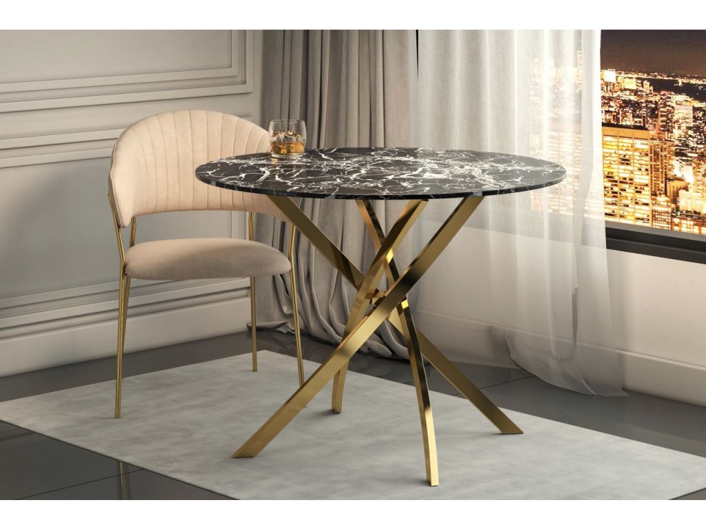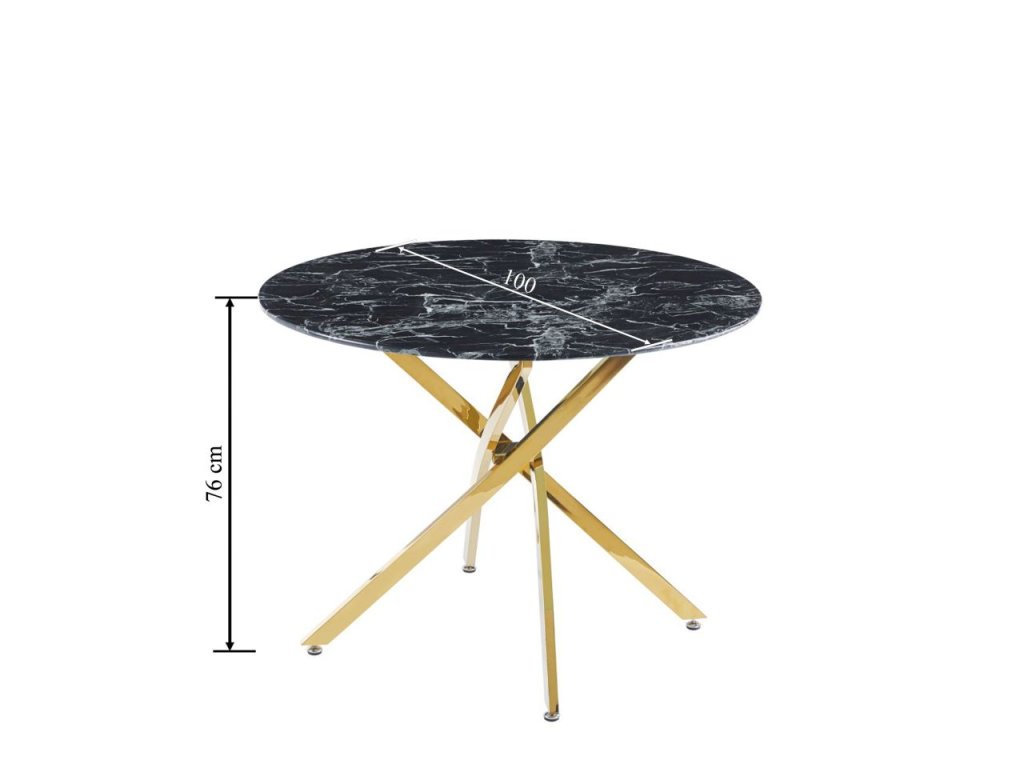 Tento luxusní kulatý jídelní stůl v atraktivní kombinaci černého mramorového efektu a zlatých kovových nohou je dokonalým doplňkem pro moderní, glamour a elegantní interiéry. Díky svému výraznému designu se stane dominantou jídelny či kuchyně a dodá prostoru nádech luxusu a exkluzivity.