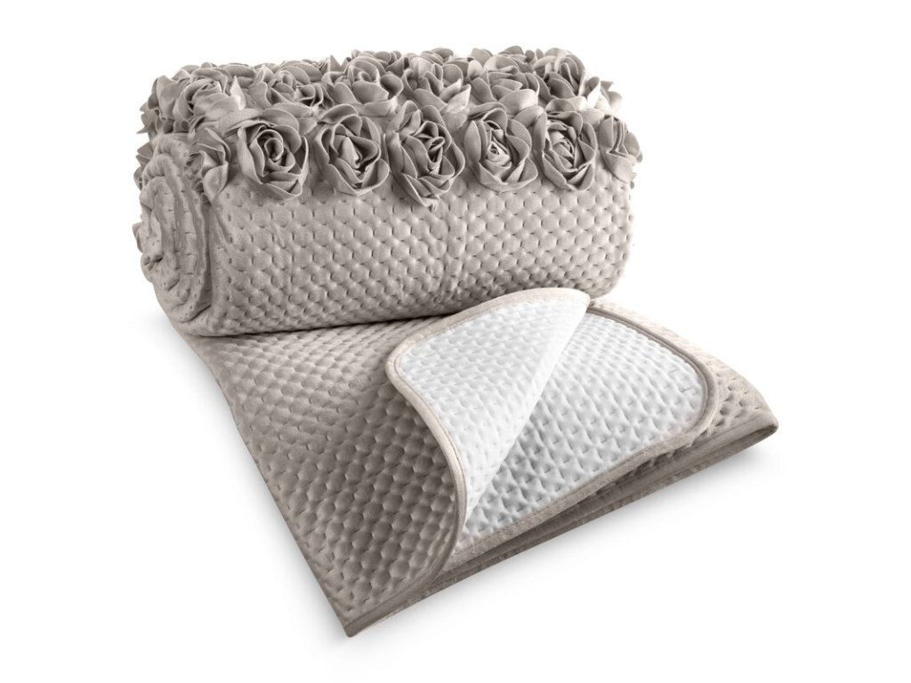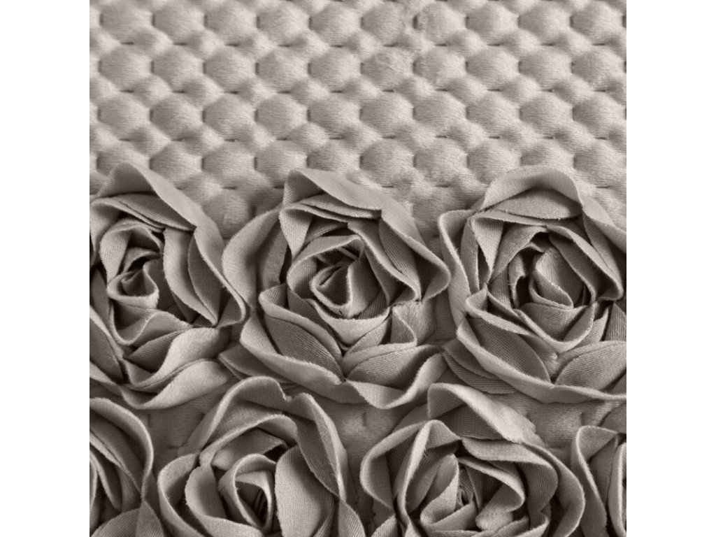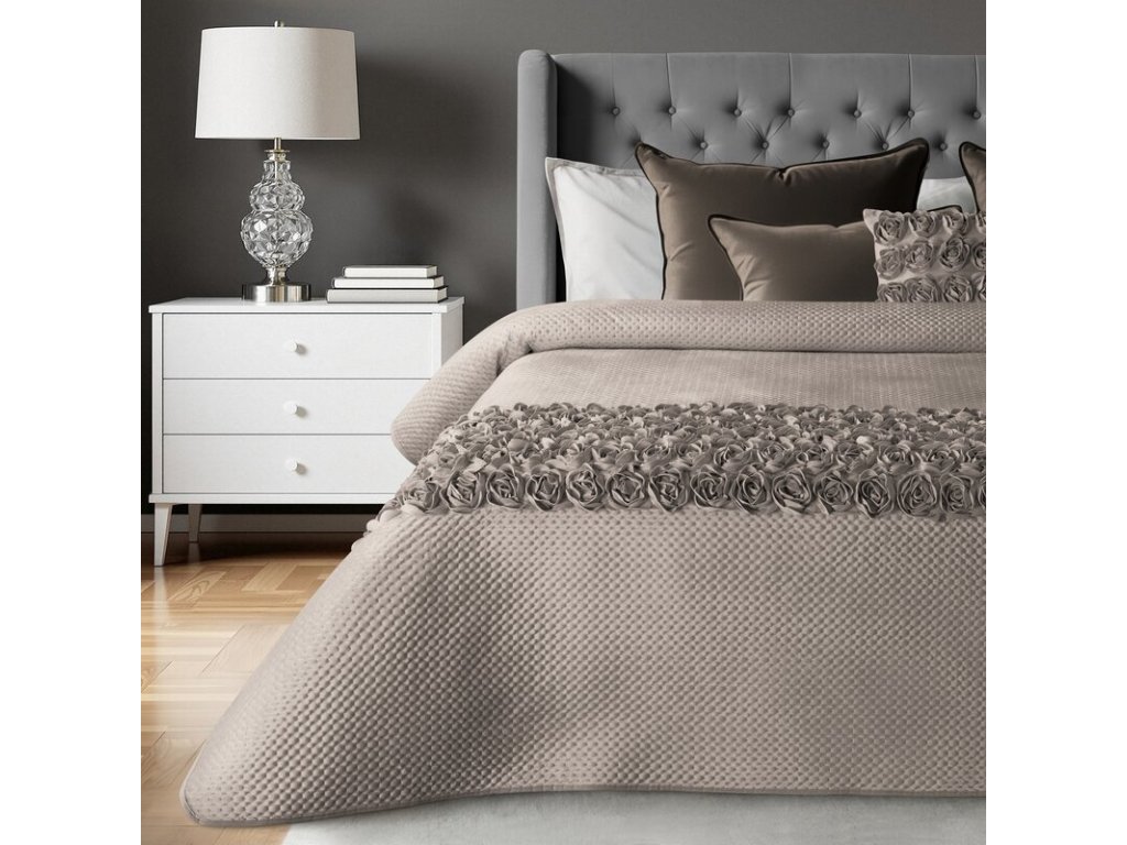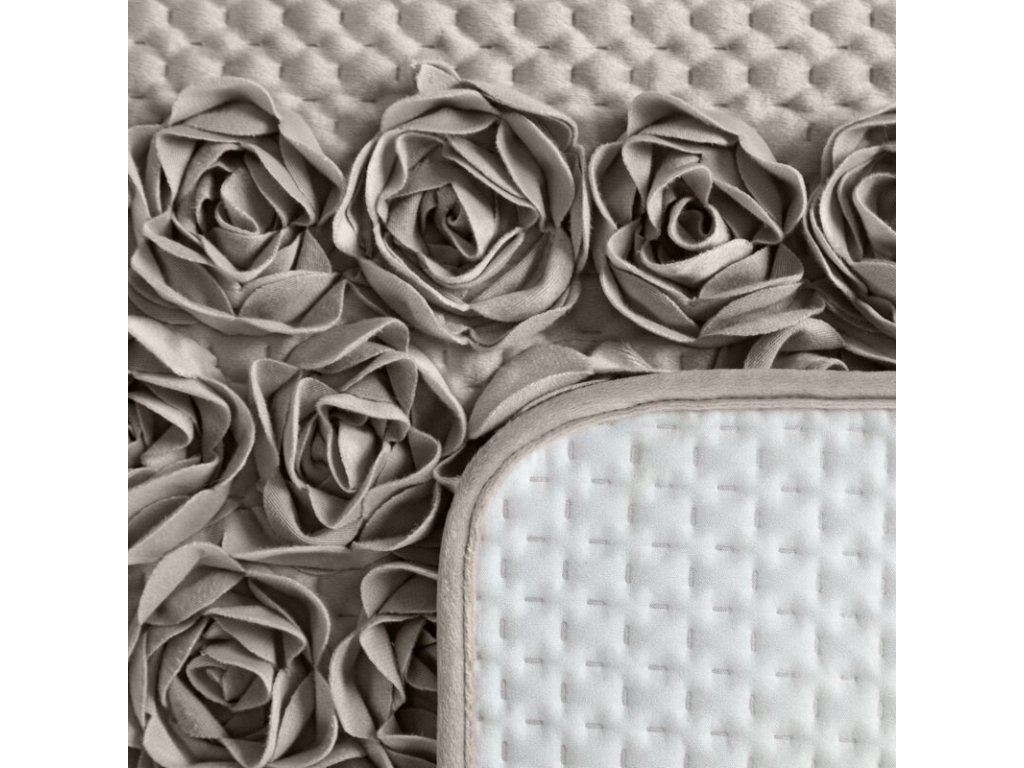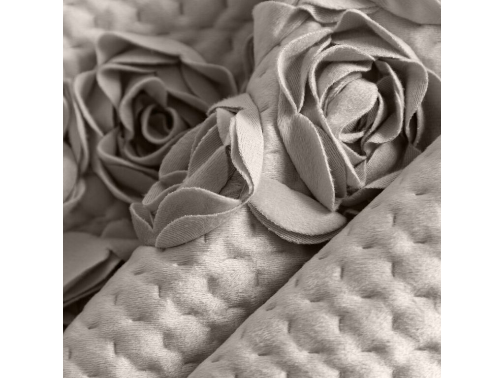 Dominantním prvkem je široký pás ručně tvarovaných růží , které dodávají přehozu jemný romantický charakter. V kombinaci s moderní béžovou barvou vytváří elegantní doplněk vhodný do klasických, moderních i glamour ložnic.