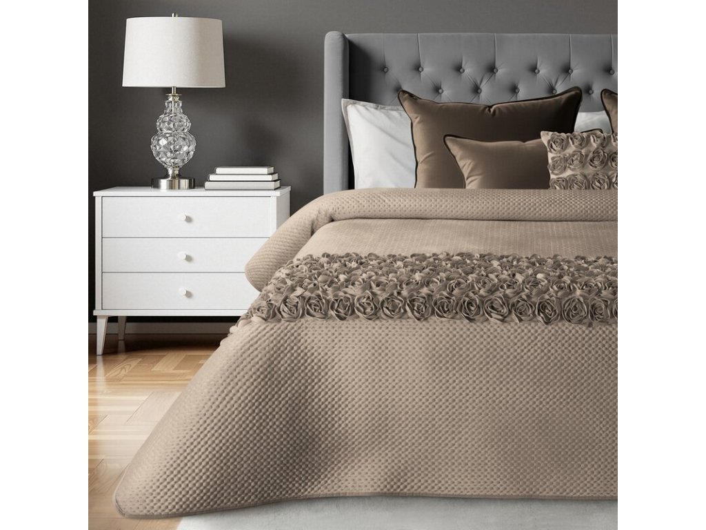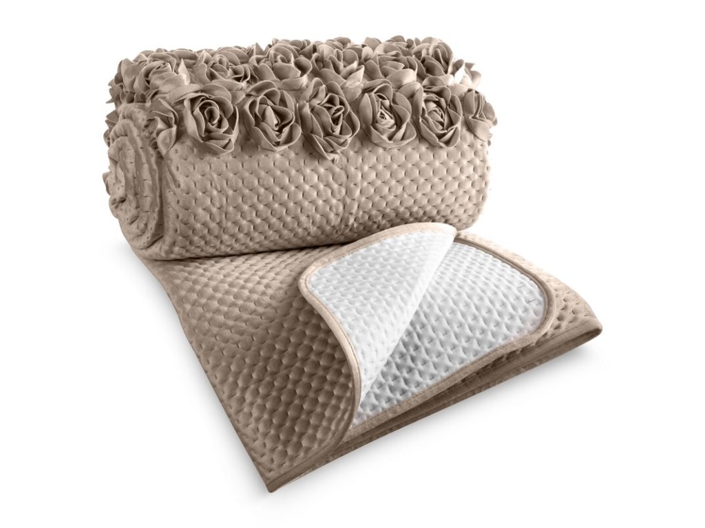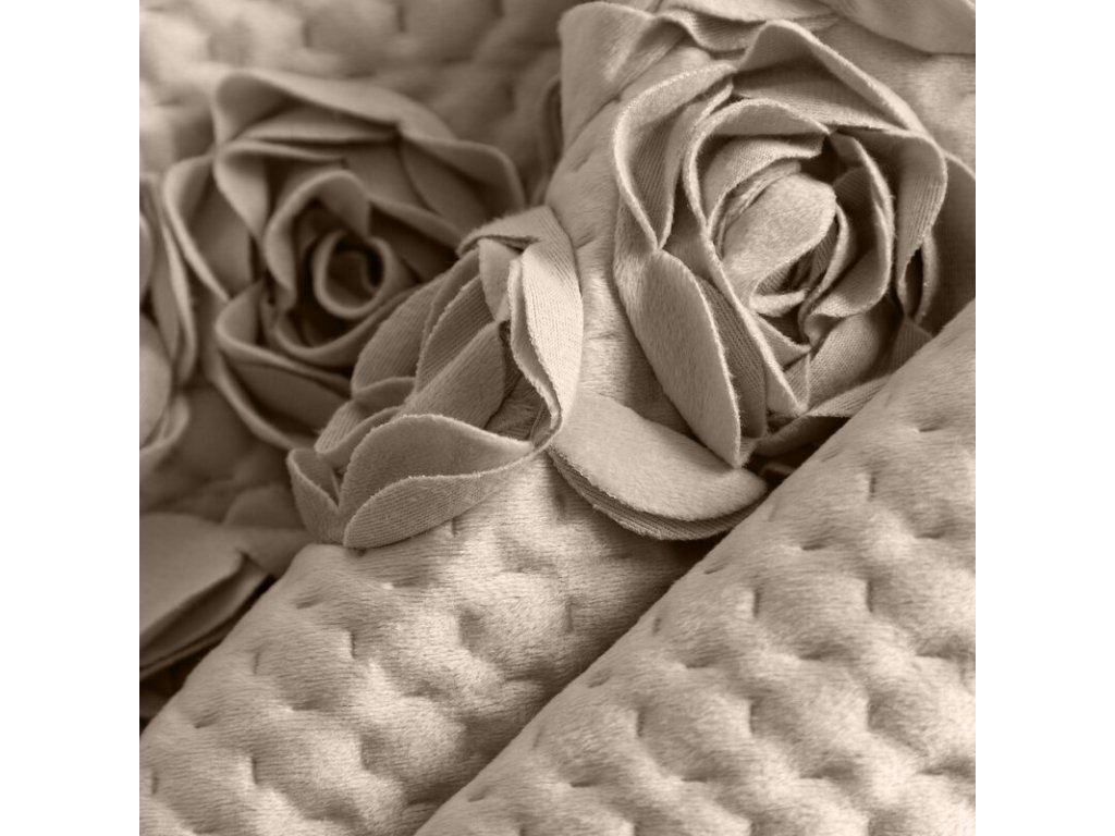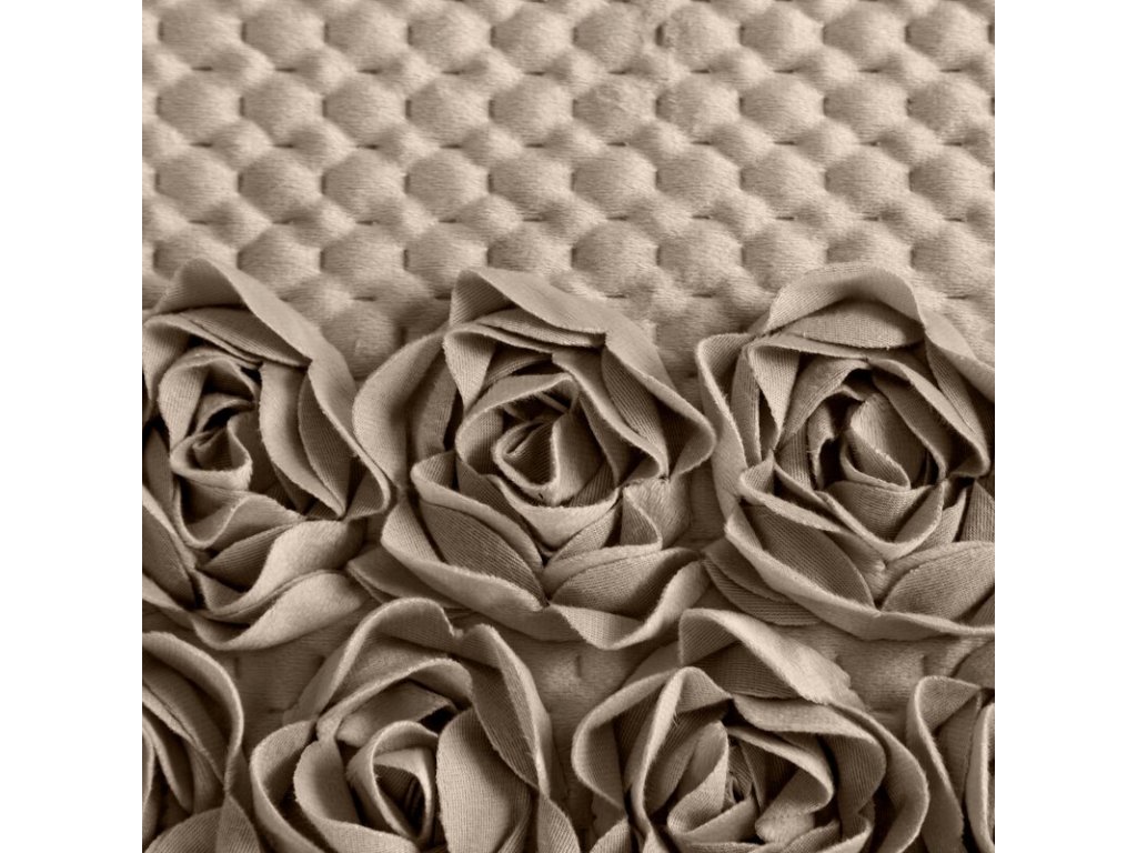 Nejvýraznějším prvkem je dekorativní pás 3D růží , pečlivě tvarovaných z látky, které dodávají přehozu jedinečný romantický akcent. V kombinaci s moderním tmavobéžovým odstínem vzniká elegantní doplněk vhodný do ložnic ve stylu glamour, modern, classic či minimalistickém provedení.