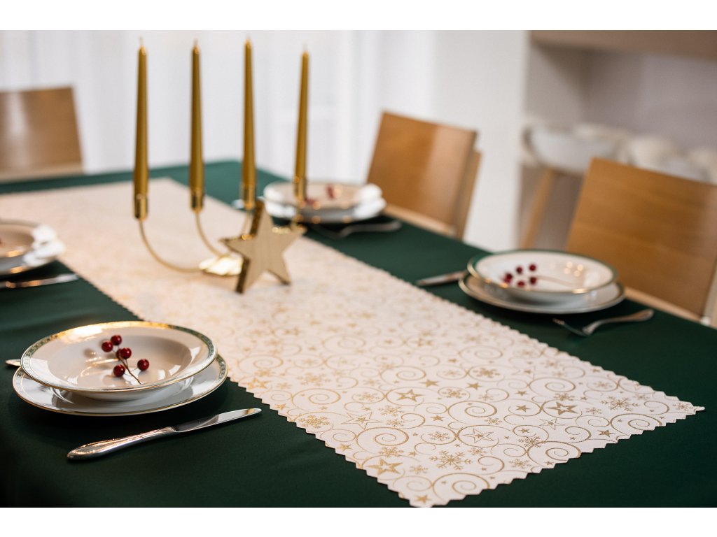 Vánoční se zlatými dekoracemi v podobě svězdiček je dokonalou dekorací na stůl, která poslouží jak během Štědrého večera, tak i při jiných svátečních setkáních.