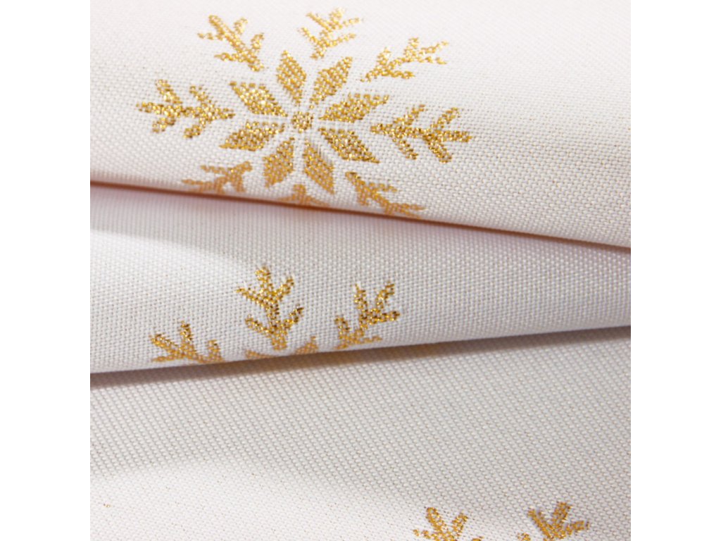 Běhoun CHRISTMAS SNOWFLAKE se zlatými dekoracemi v podobě vloček je dokonalou dekorací na stůl, která poslouží jak během Štědrého večera, tak i při jiných svátečních setkáních.