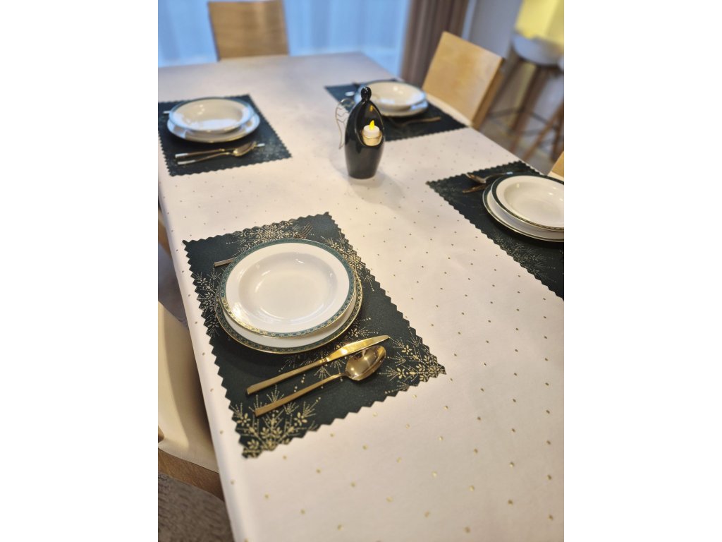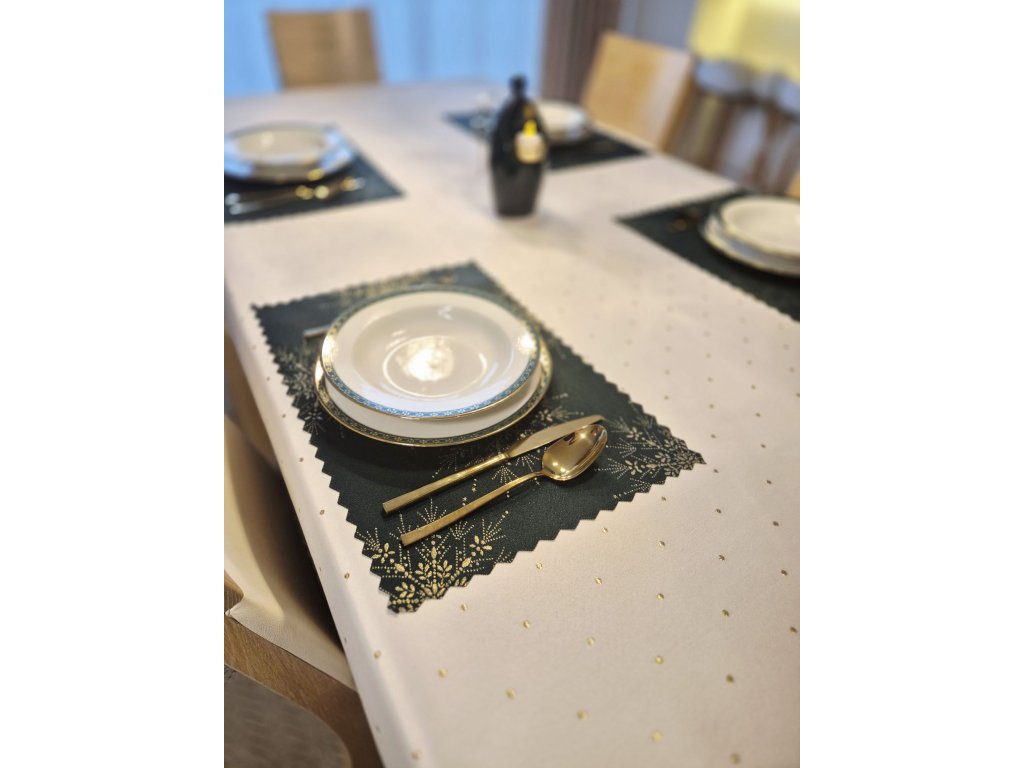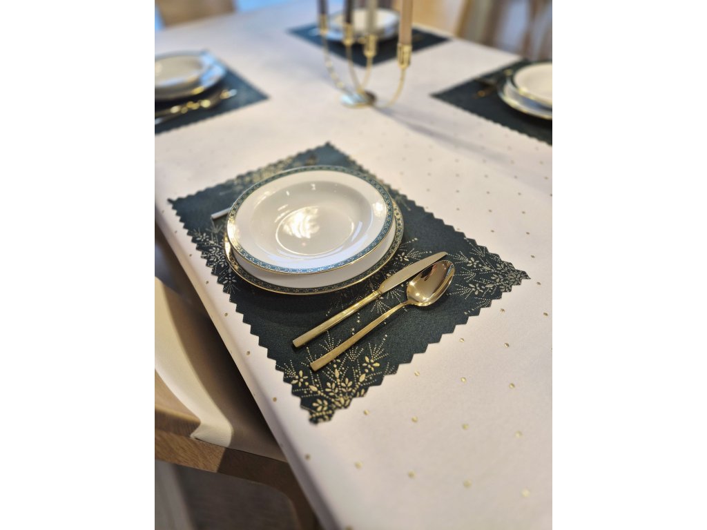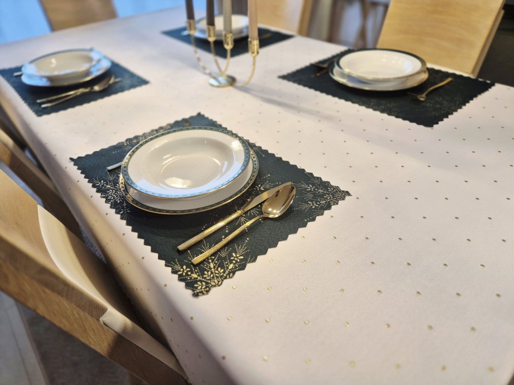 Luxusní vánoční prostírání v kombinaci barev tmavě zelené a zlaté, má kromě estetických funkcí i praktické funkce. Chrání desku stolu a přitom působí elegantně.
