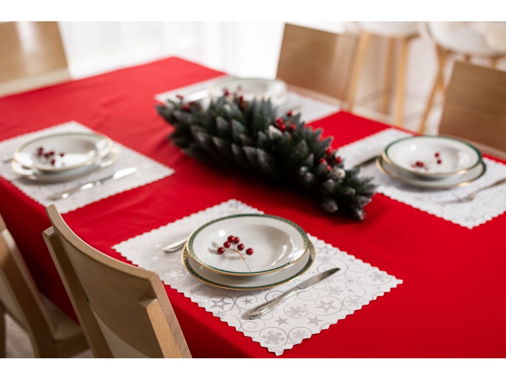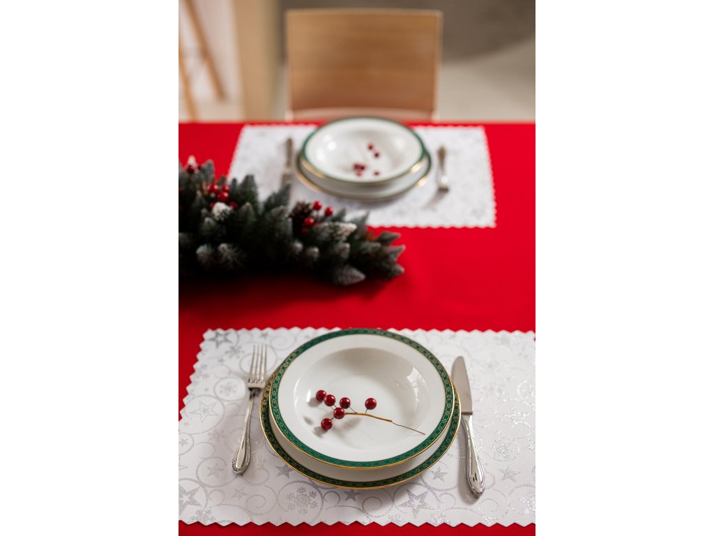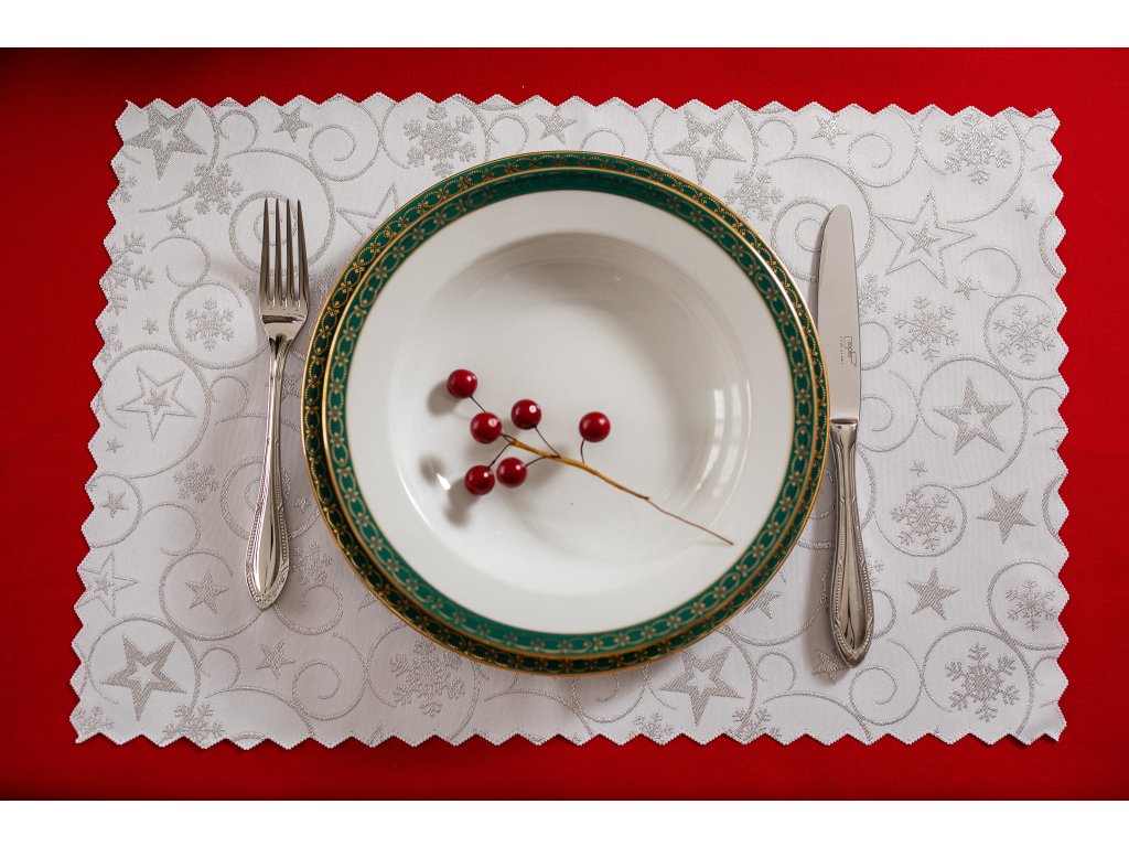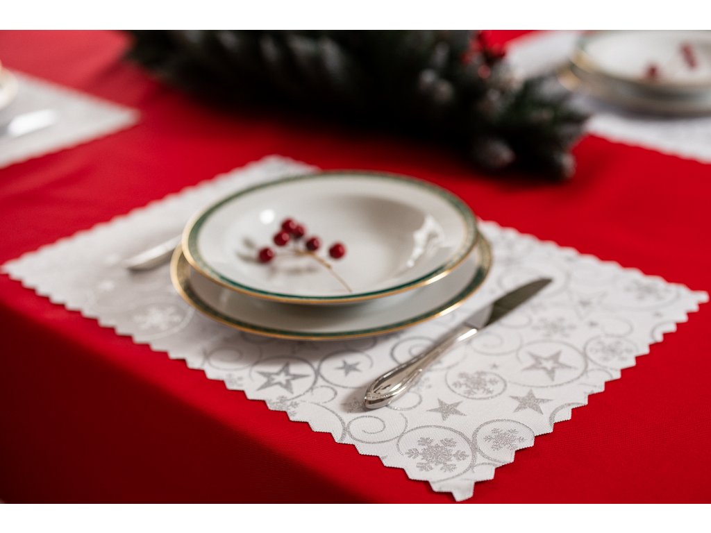Luxusní vánoční prostírání ve stříbrné barvě má kromě estetických funkcí také praktické funkce. Chrání desku stolu a přitom působí elegantně.