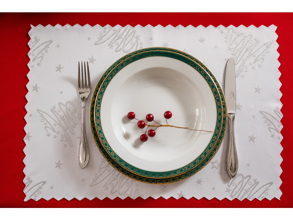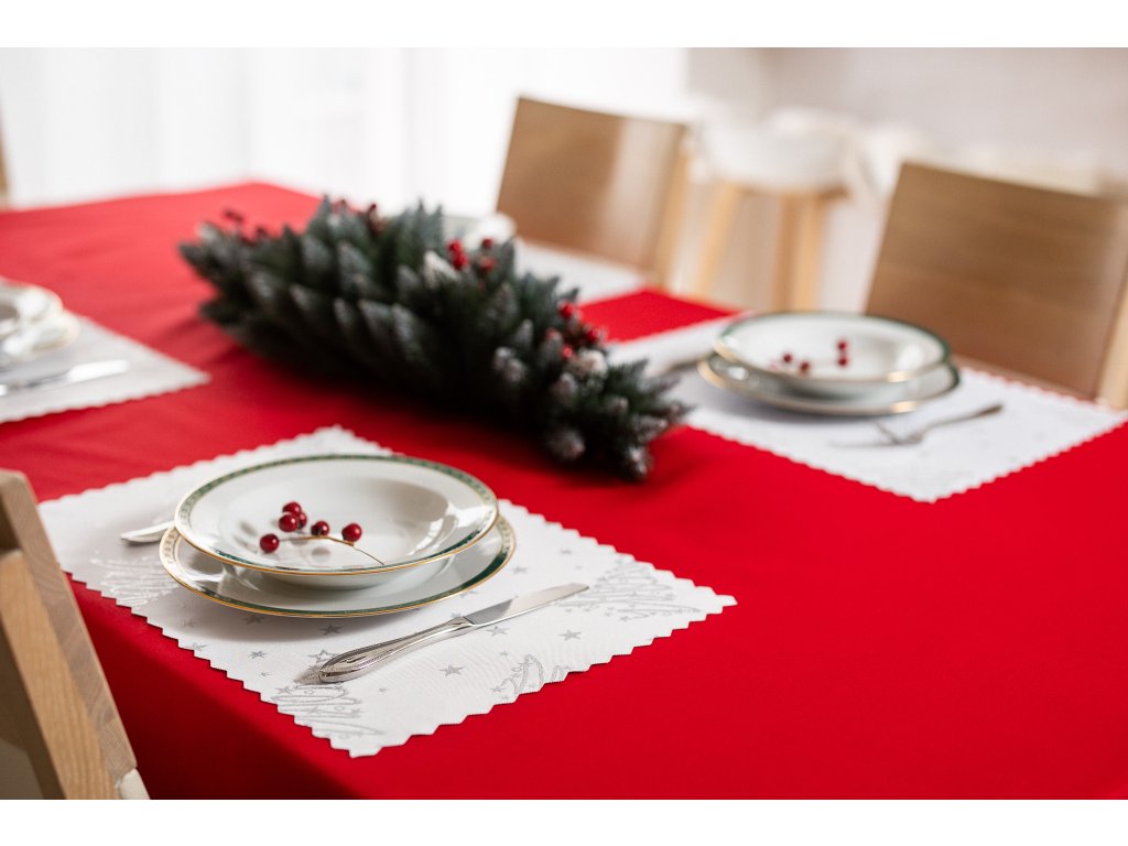 Luxusní vánoční prostírání ve stříbrné barvě má kromě estetických funkcí také praktické funkce. Chrání desku stolu a přitom působí elegantně.
