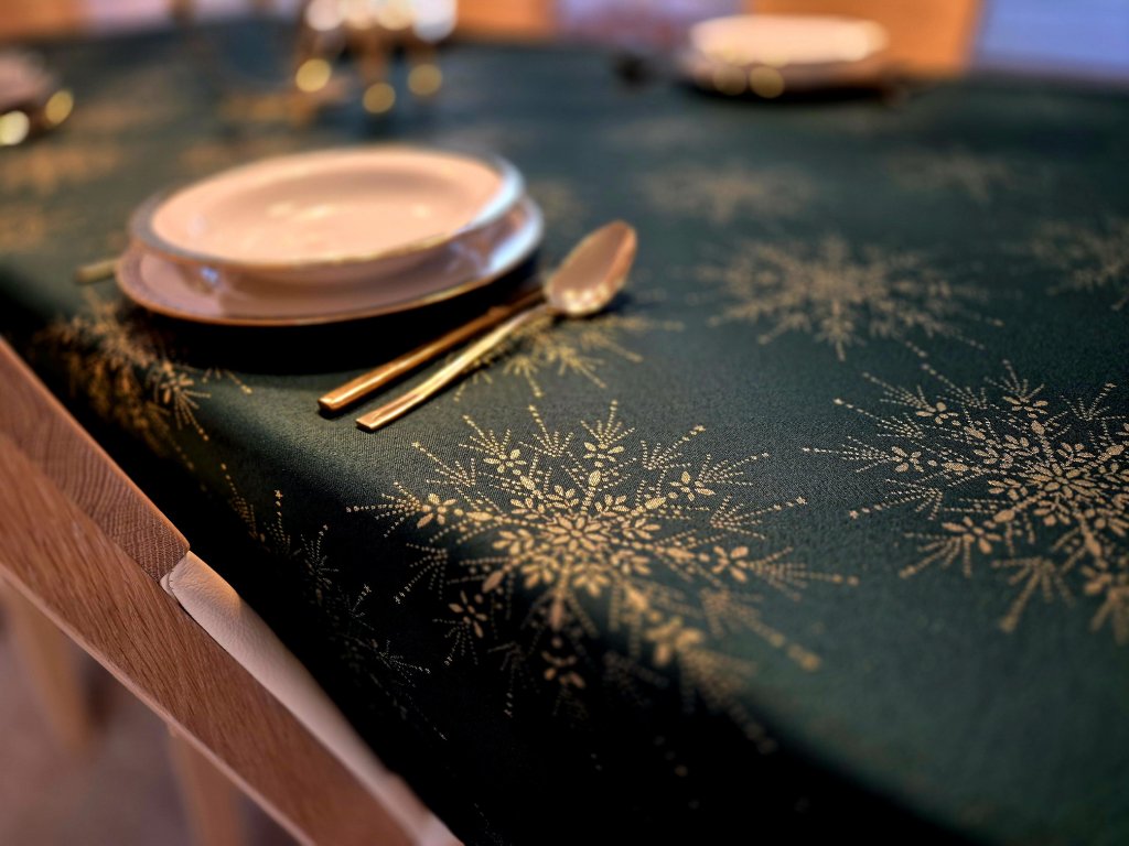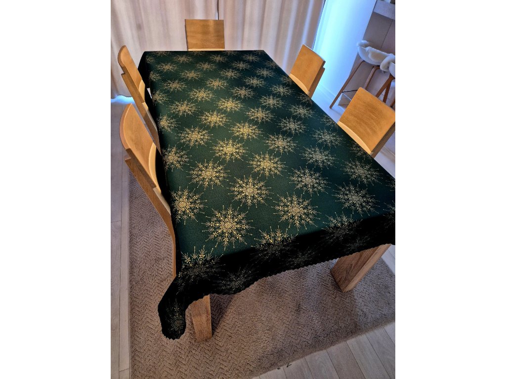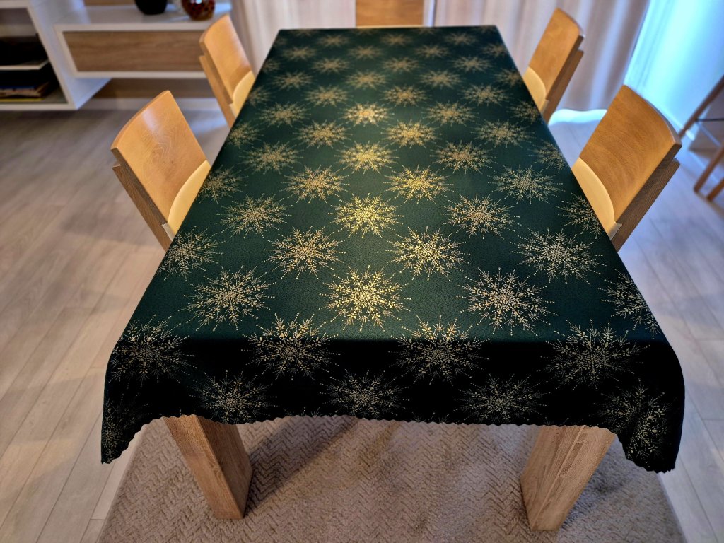Luxusní Vánoční ubrus s vločkami - zeleno-zlatý SW28