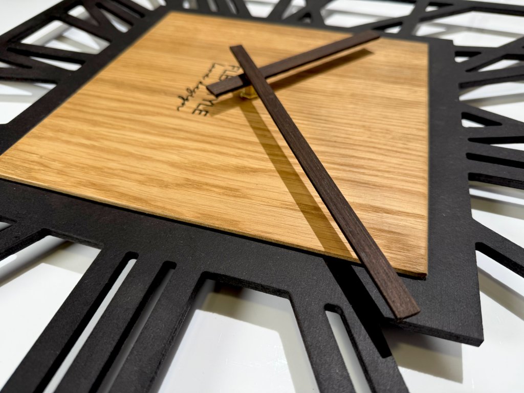 ✔️ Přírodní dub – střed hodin zdobí dýha z dubového dřeva v tmavě hnědém odstínu, která zvýrazňuje ušlechtilost materiálu a přináší do interiéru útulnost.