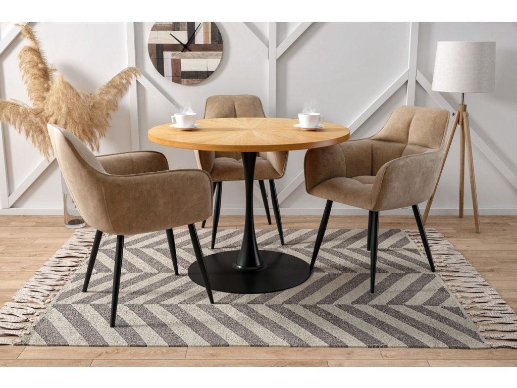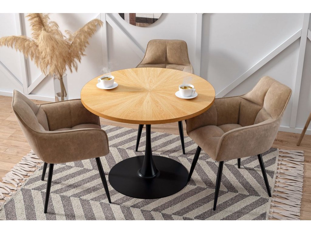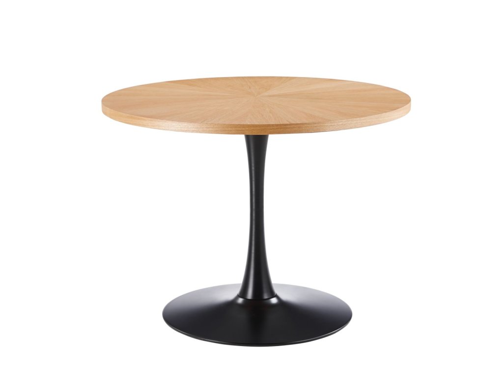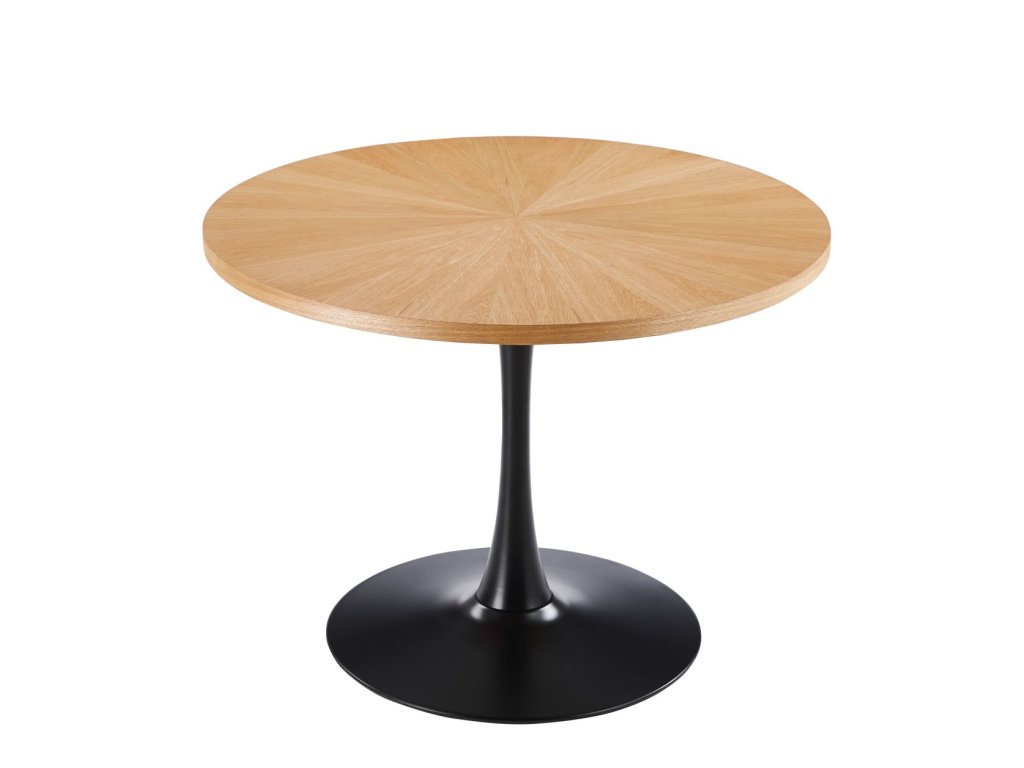 Dominantním designovým prvkem stolu je centrální kovová noha v černé matné úpravě. Kuželová podstava zajišťuje výbornou stabilitu, dostatek prostoru pro nohy a zároveň dodává stolu lehký, vzdušný vzhled. Díky centrální noze je sezení kolem stolu maximálně komfortní a praktické.