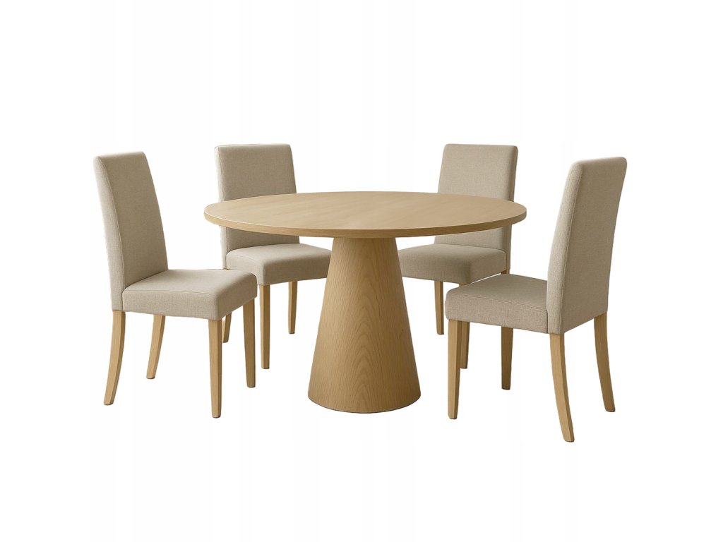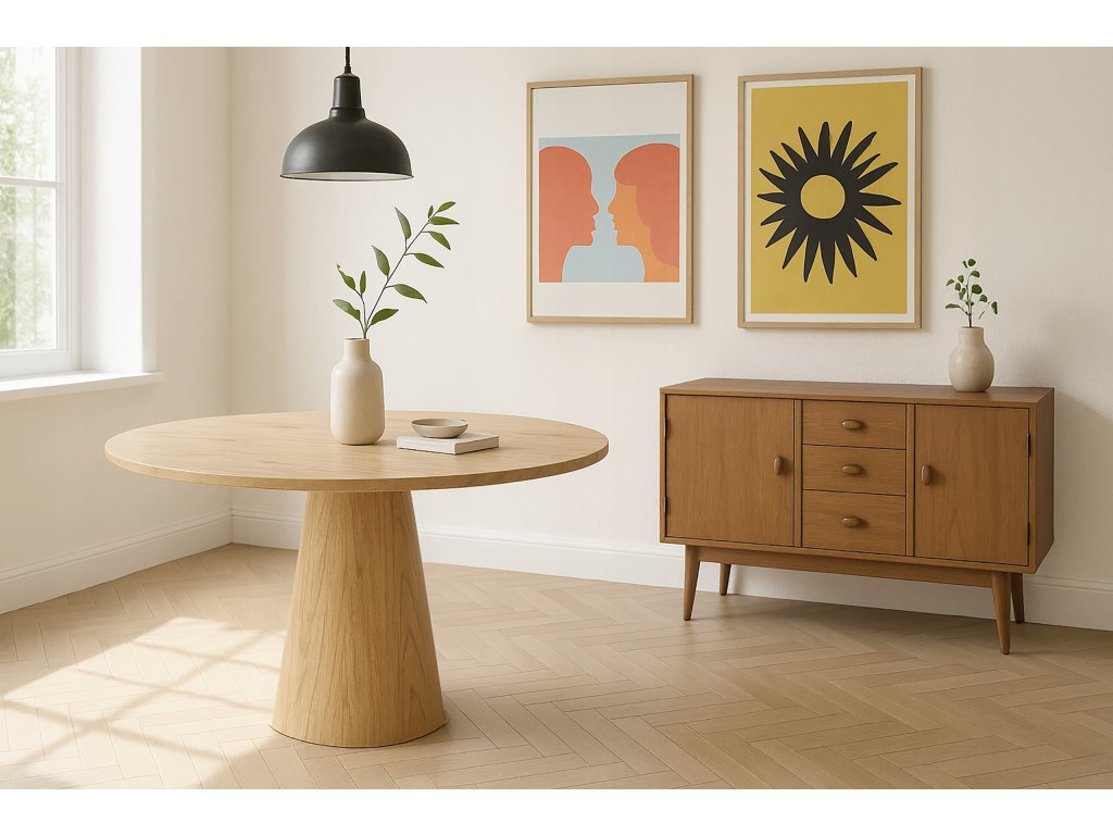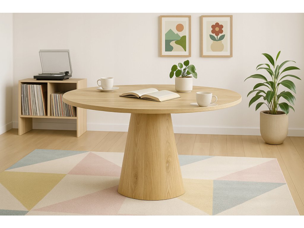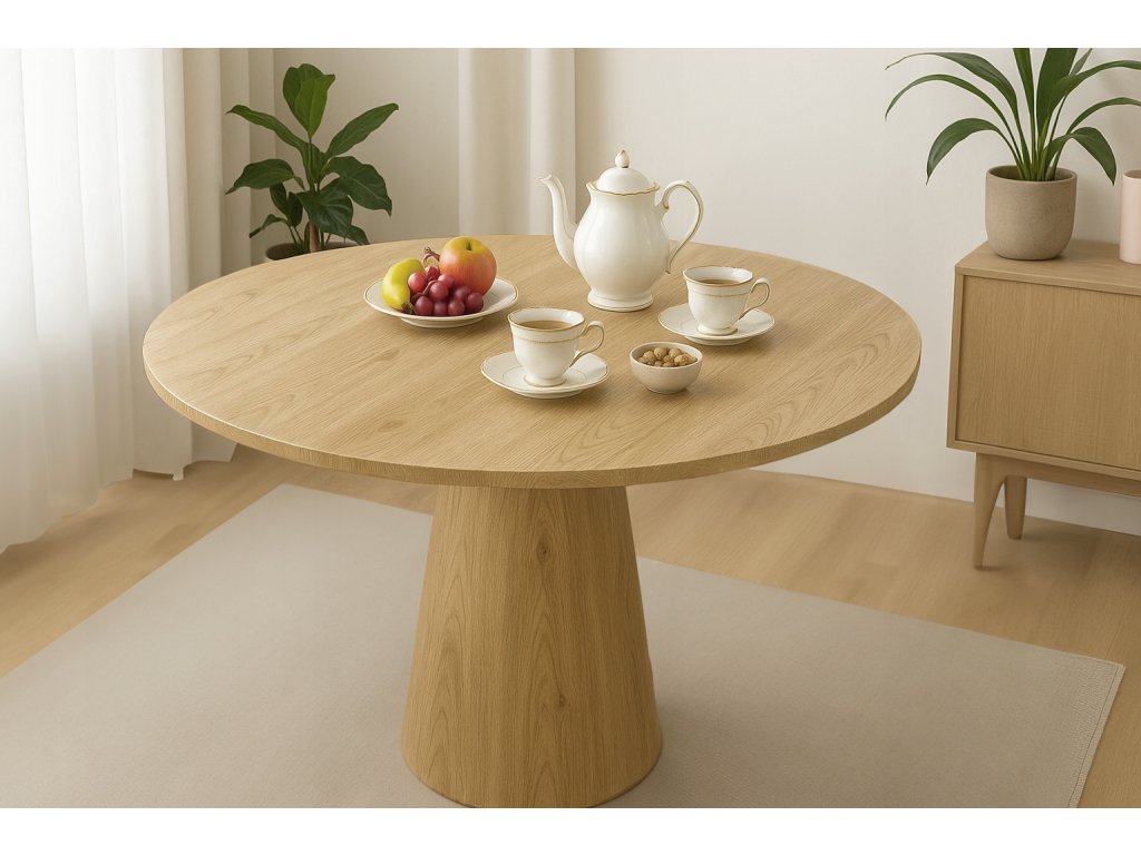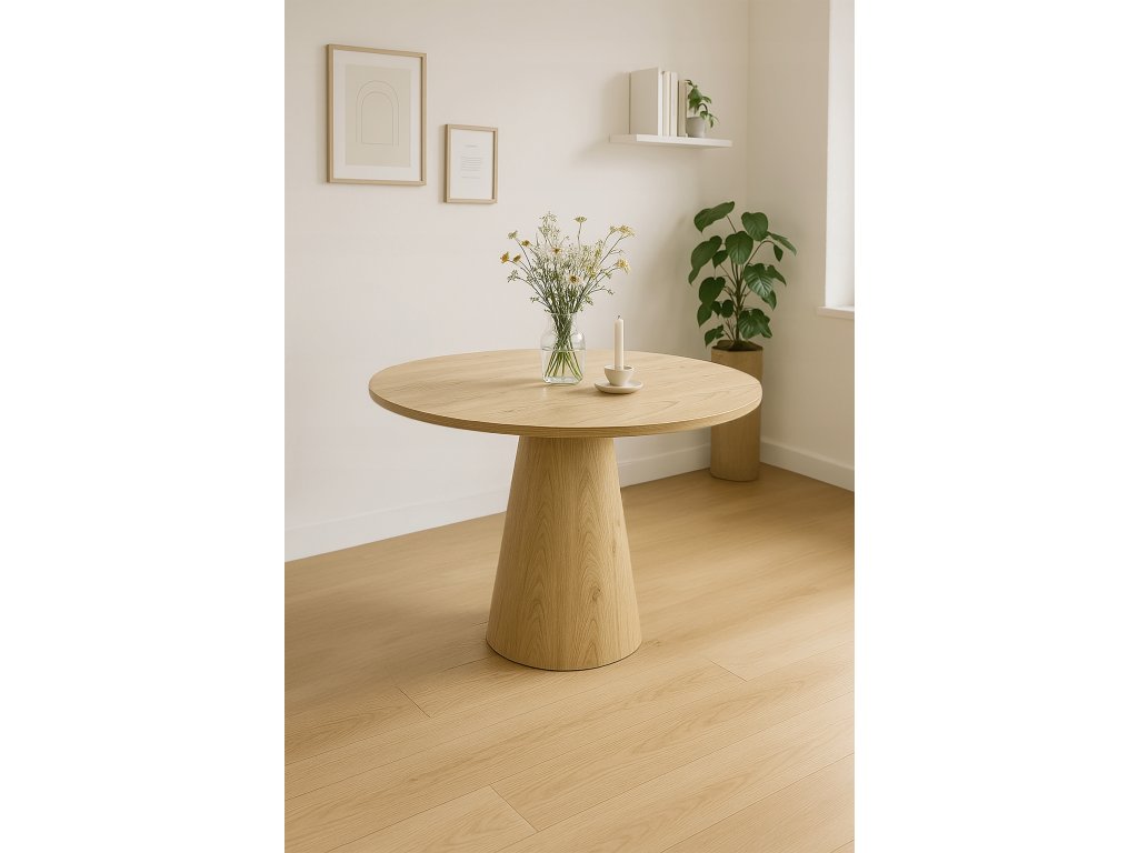 Hledáte výrazný, ale stále nadčasový kousek do jídelny? Jídelní stůl OTTO Ø100 cm v dekoru dub je ideální pro interiéry ve stylu Scandi a Japandi – spojuje čisté linie, přírodní vzhled a moderní siluetu. Kulatá deska vytváří příjemnou atmosféru při stolování, podporuje komunikaci a hodí se do kuchyně, jídelny i obývacího pokoje.