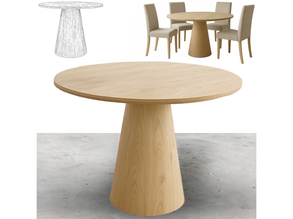 Dominantou stolu je kuželová noha se jemně zaobleným profilem , která působí designově a zároveň poskytuje stabilní oporu. Deska z MDF je upravena odolným 3D papírem s vyšší odolností proti poškrábání, díky čemuž je stůl praktický i pro každodenní používání. OTTO krásně vynikne v minimalistických aranžmá, ale stejně dobře se hodí i do odvážnějších, barevných interiérů.