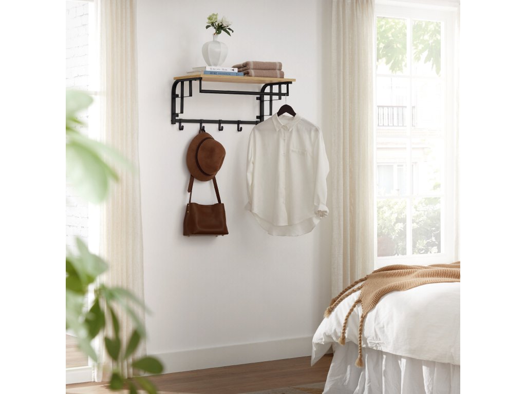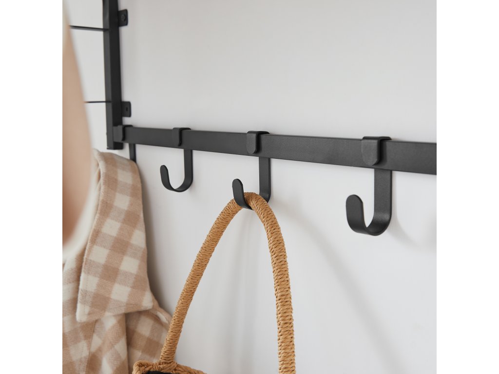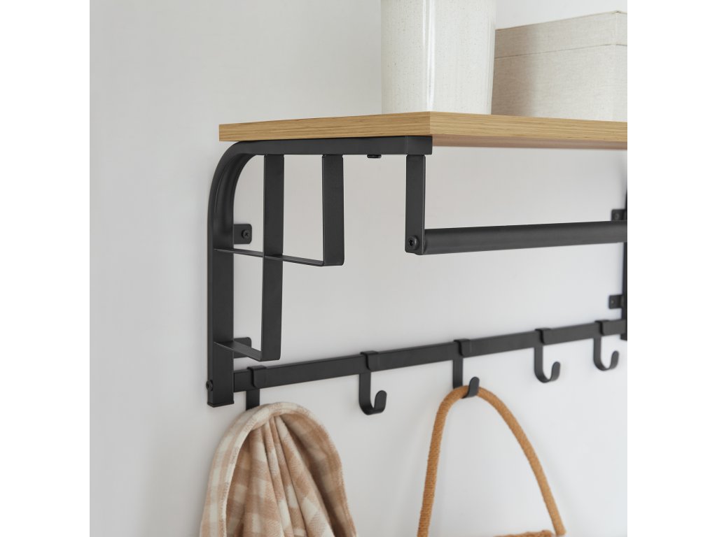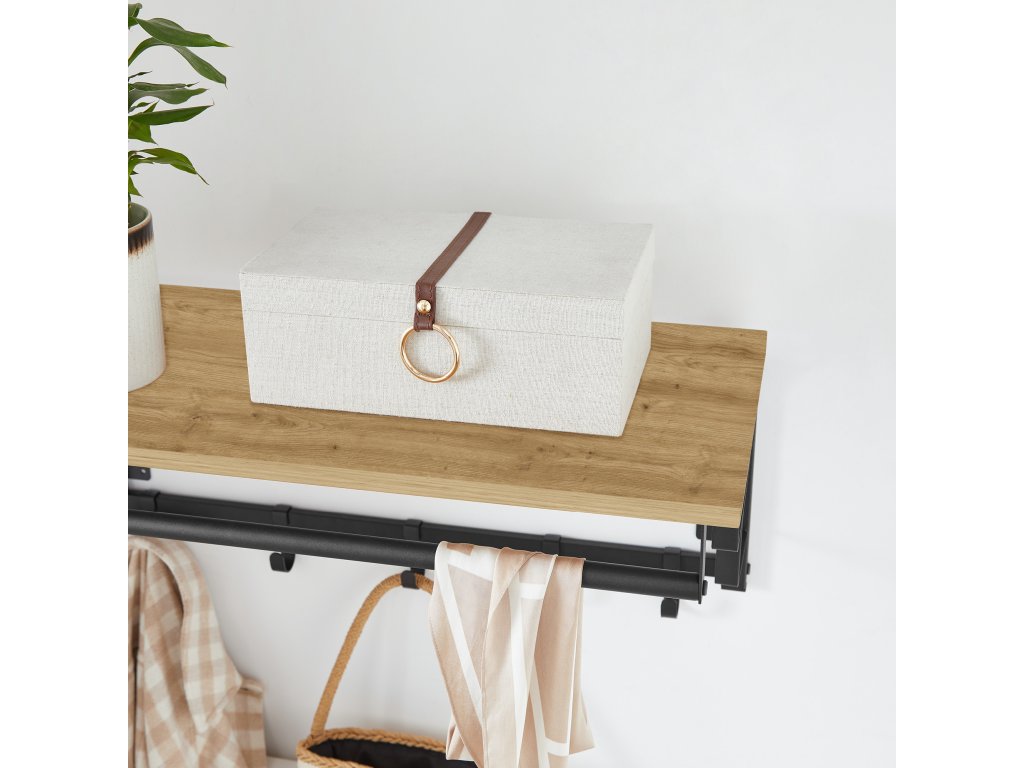 Horní police poskytuje dostatek prostoru pro dekorace, rostliny, knihy či úložné boxy. Spodní kovová tyč a posuvné háčky nabízejí flexibilní řešení pro zavěšení kabátů, tašek, klíčů, šál nebo kuchyňských doplňků. Díky možnosti volného posouvání háčků si rozložení snadno přizpůsobíte vlastním potřebám.