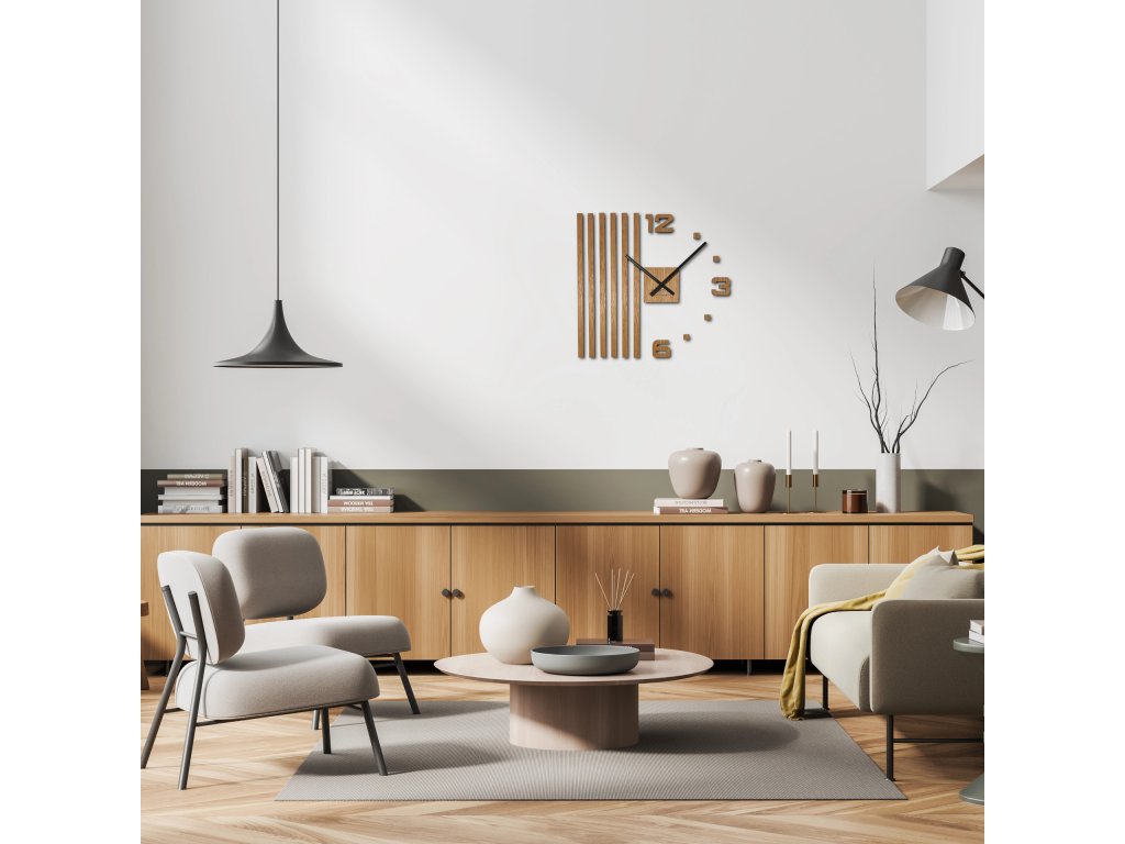 Nástěnné dřevěné hodiny LAMELE slim jsou jedinečným designovým prvkem, který dokonale navazuje na populární trend dřevěných lamel v interiéru . Vertikální linie v kombinaci s jemnou kruhovou formou ciferníku vytváří harmonický celek, který působí moderně, elegantně a zároveň přirozeně. Hodiny tak nejsou jen praktickým ukazatelem času, ale také výraznou dekorací stěny , která okamžitě přitáhne pozornost.