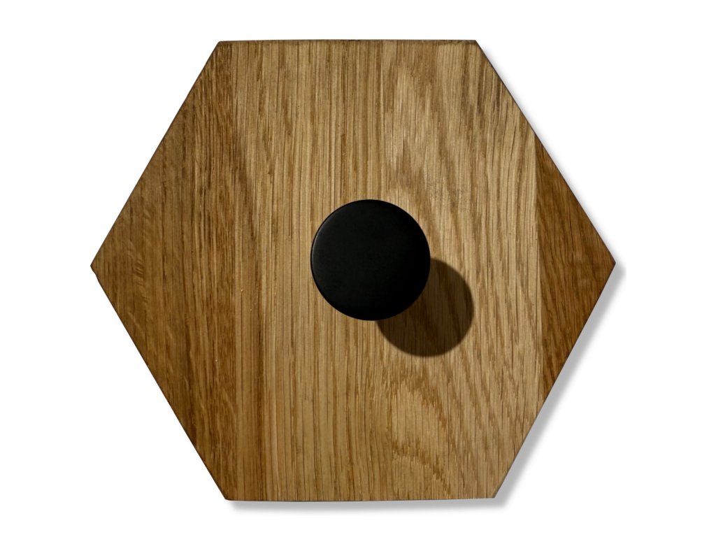 Minimalistický a elegantní nástěnný věšák ve tvaru pravidelného šestiúhelníku, vyrobený z masivního dubového dřeva.