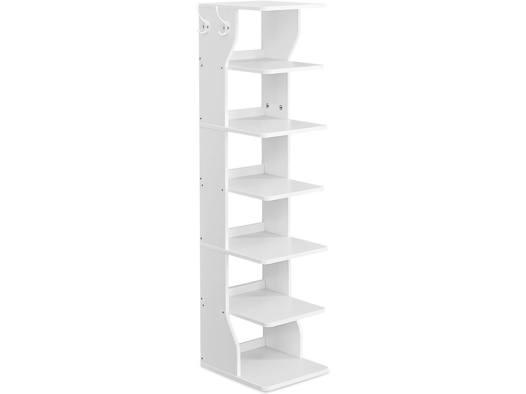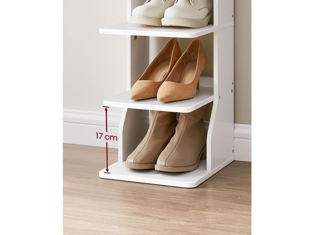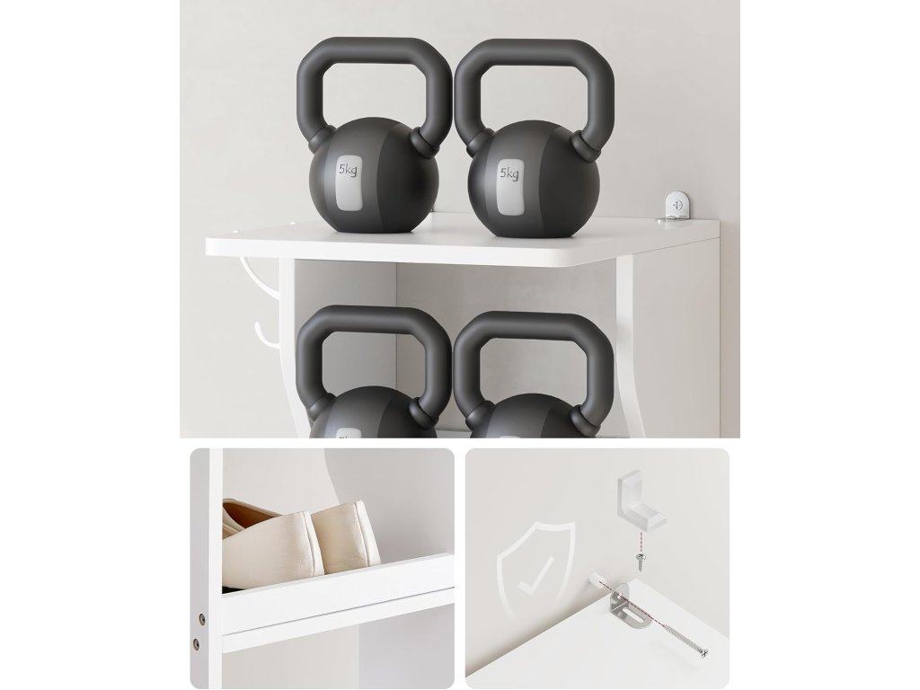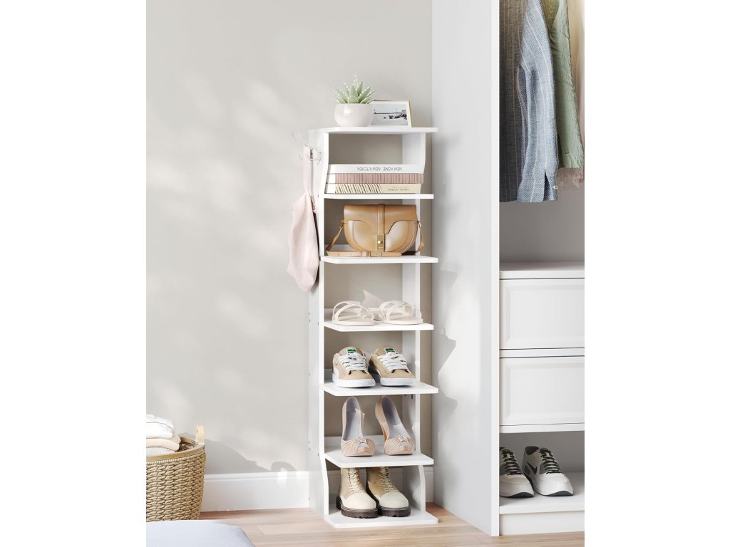 Regál nabízí šest prostorných polic , které jsou ideální pro uložení sportovní obuvi, lodiček, kotníkových bot, pantoflí, sandálů či drobných doplňků. Dva praktické boční háčky poskytují dodatečný úložný prostor na kabelky, tašky, šály, pásky nebo klíče, díky čemuž budete mít vše potřebné vždy po ruce.