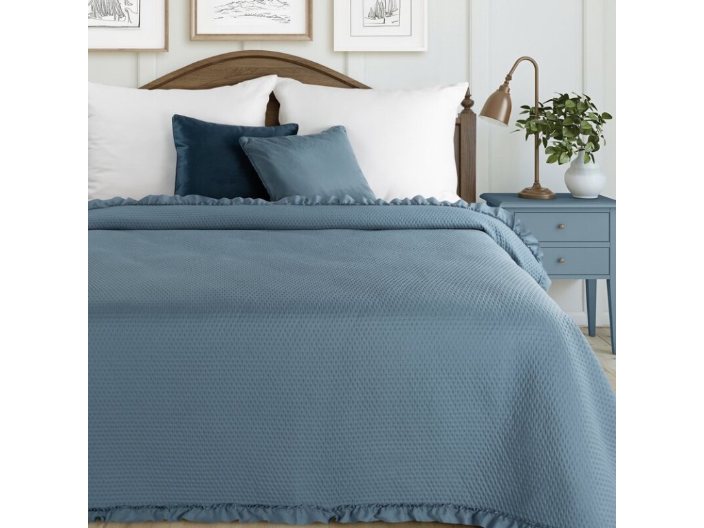 Elegantní modrý přehoz na postel s dekorativní volánovou lemovkou dokonale doplňuje každý interiér ložnice.
